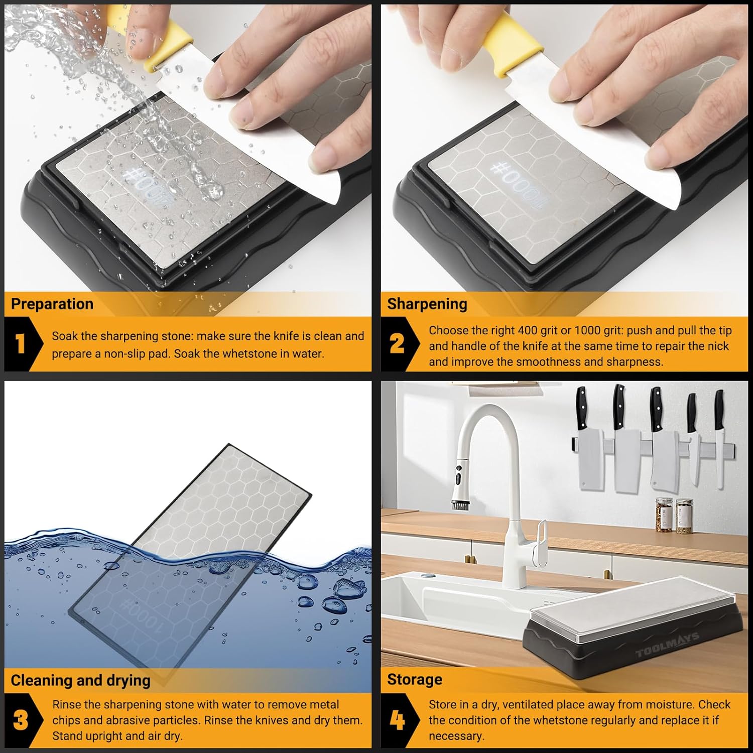 - 【 Dual-Sided Multi-Function Whetstone Set 】The Toolmays Whetstone Set includes two different grits: The 400# diamond whetstone quickly repairs large blade notches and restores basic sharpness, while the 1000# diamond whetstone is perfect for daily maintenance and fine grinding. The unique honeycomb design ensures that dust generated during grinding does not affect the sharpening process.