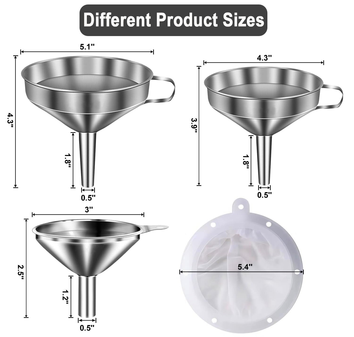 - [3 Size Multitasking Kit] Cooking funnels set of 3, large (5.1 "/12.95 cm); Medium (4.3 "/10.9 cm); Small (3 "/7.6 cm) for your different needs. Includes two removable filters &200 mesh food filters to help prevent stem clogging.