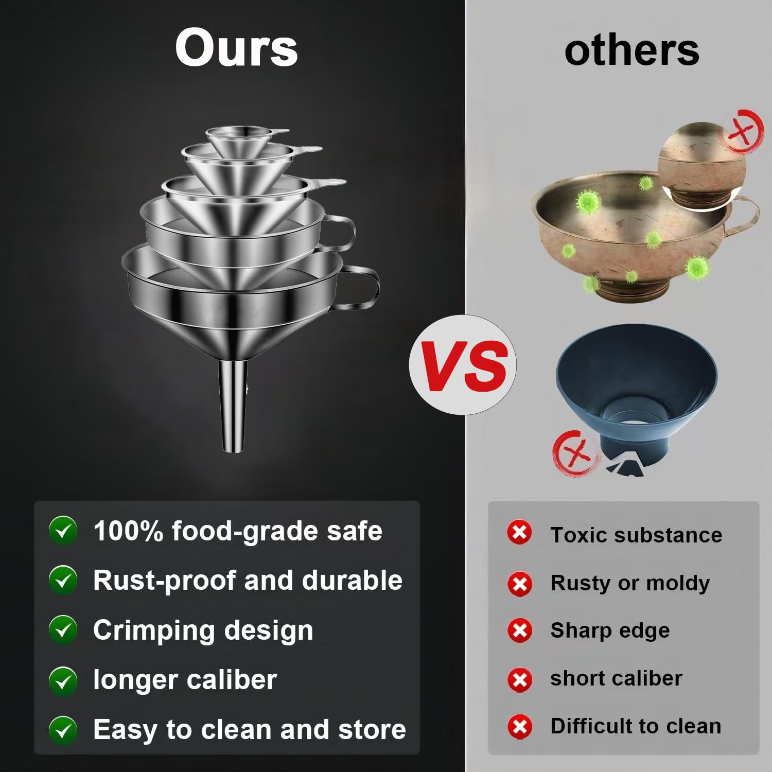- [Heavy-Duty & Lasting Design] Commercial food grade stainless steel outperforms plastic funnels with unbreakable construction and no BPA-free. Resists breaking, bending, scratching-perfect for hot oils, soups, or freezer storage. Smooth surface prevents bacterial growth, for spices, oils, and preserves.