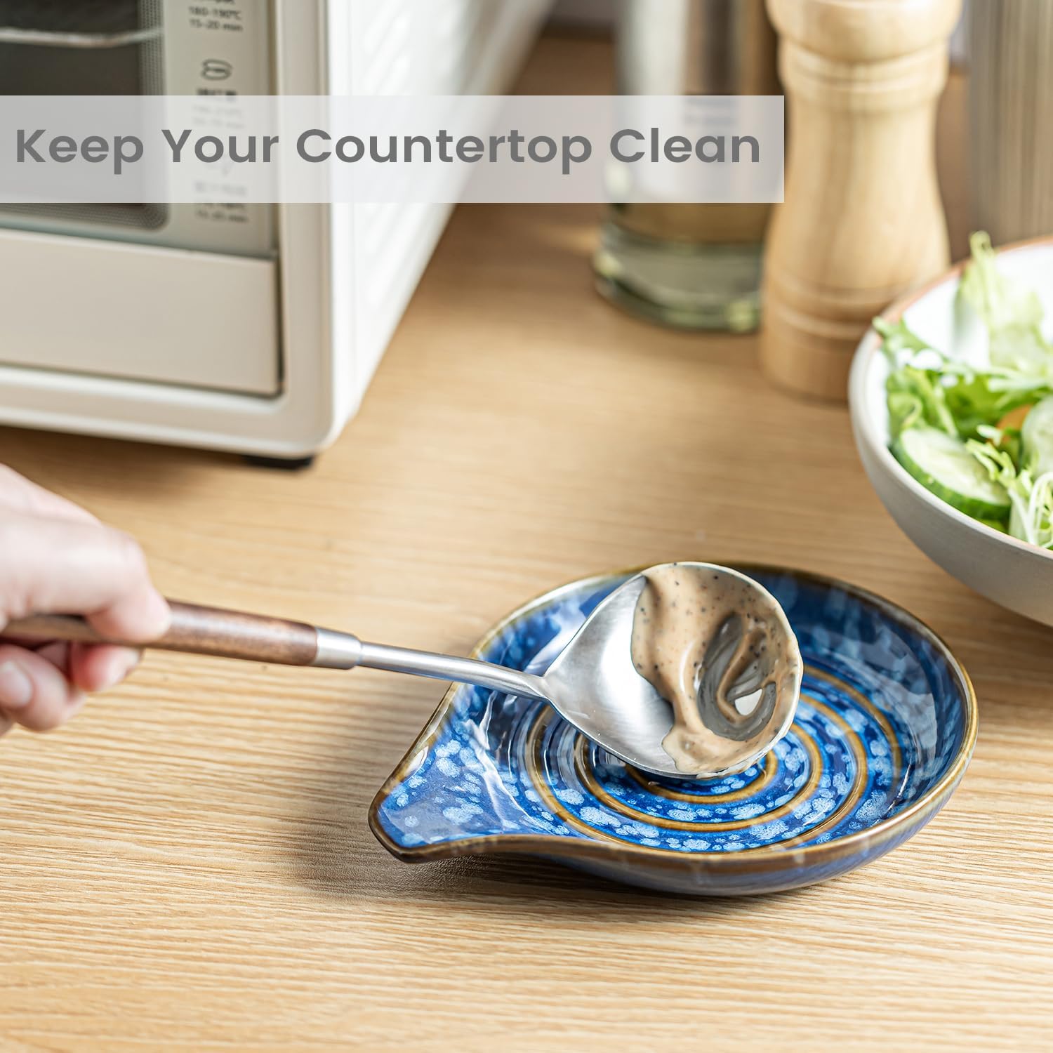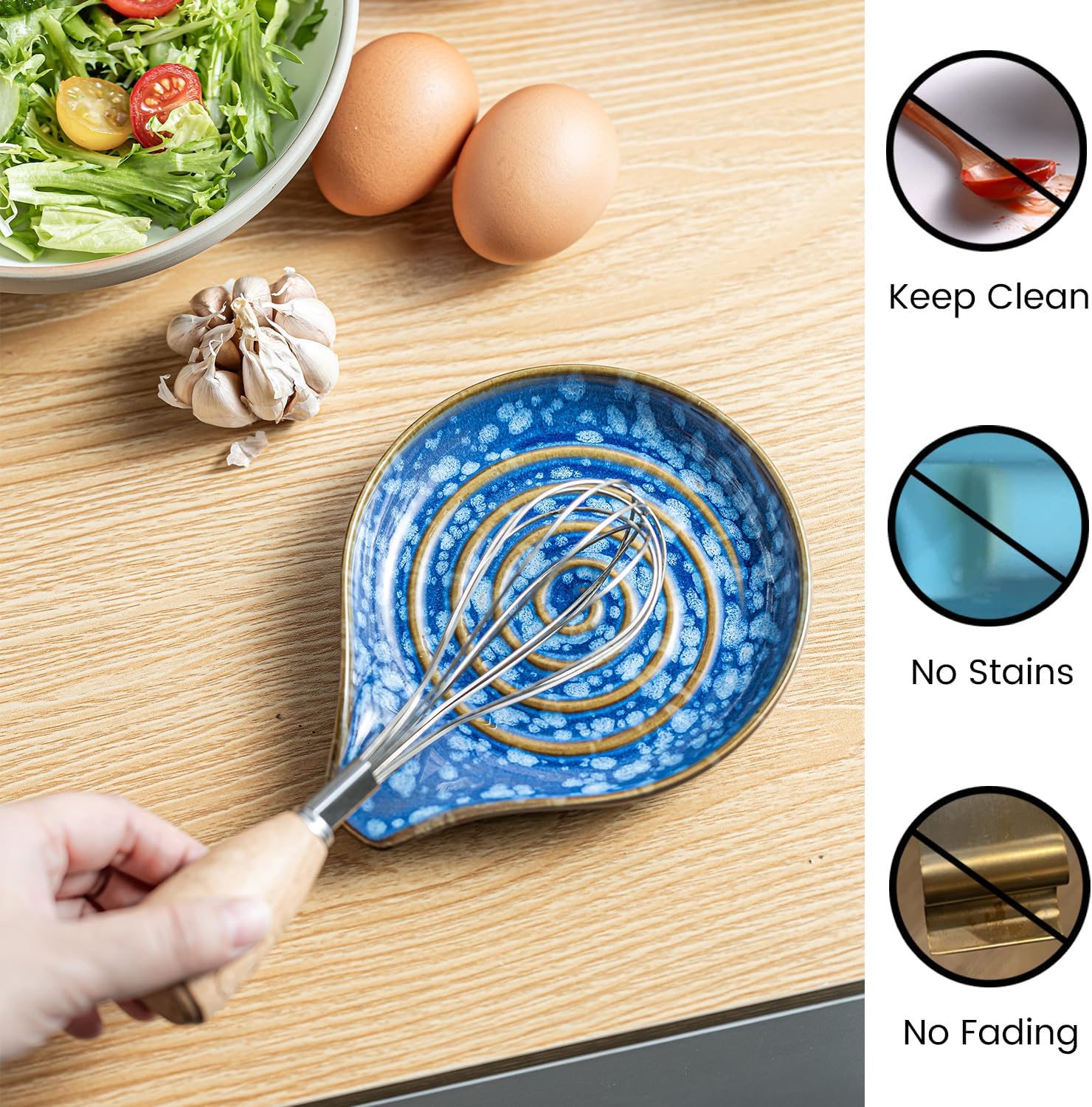- 【Eye-Catching Design】This ceramic spoon rest features a stunning blue glaze with white speckles, creating a visually appealing and modern aesthetic. Its unique spiral pattern in the center adds a touch of artistic flair, making it a stylish addition to any kitchen