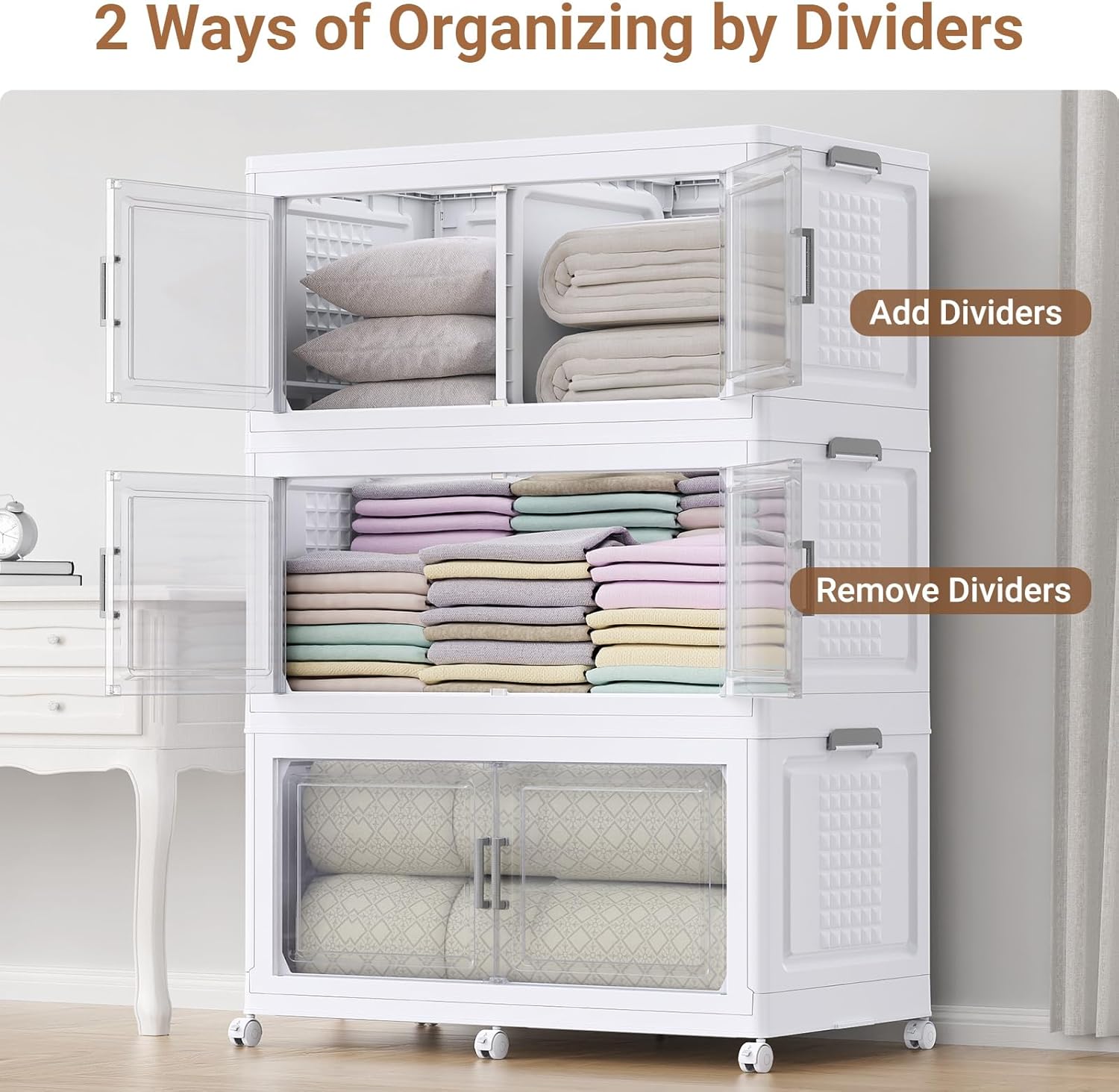 - 【Extra-Large Storage Bins With Dividers】BROVIEW storage bins offer an astonishing capacity of 200Qt/50Gal per tier. 4Pack foldable storage bin, equipped with doors and wheels, expands to generous dimensions of 33.5"L x 19"W x 69.3"H, can support a maxi weight of 120lb. Each tier is designed with a divider (can be rearranged or removed, removed it will reduce load-bearing capacity), you can create two distinct compartments within a single level for organized storage. (Note: 1 Set ONLY 1 LID!)