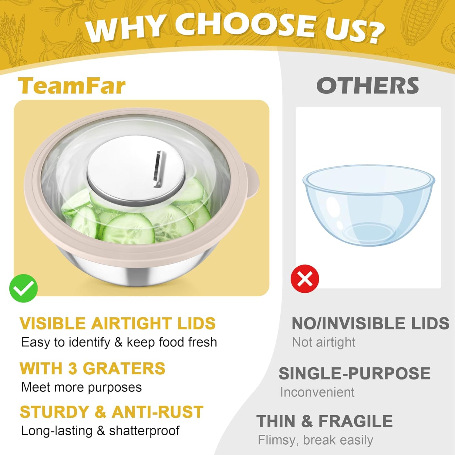 TeamFar Mixing Bowls, 3PCS Stainless Steel Serving Salad Bowls with Lids & 3 Graters, For Kitchen Mixing/Baking/Storing/Prepping, Visible & Airtight, Easy Clean - 4.5/3 / 1.5 QT, Multi-color