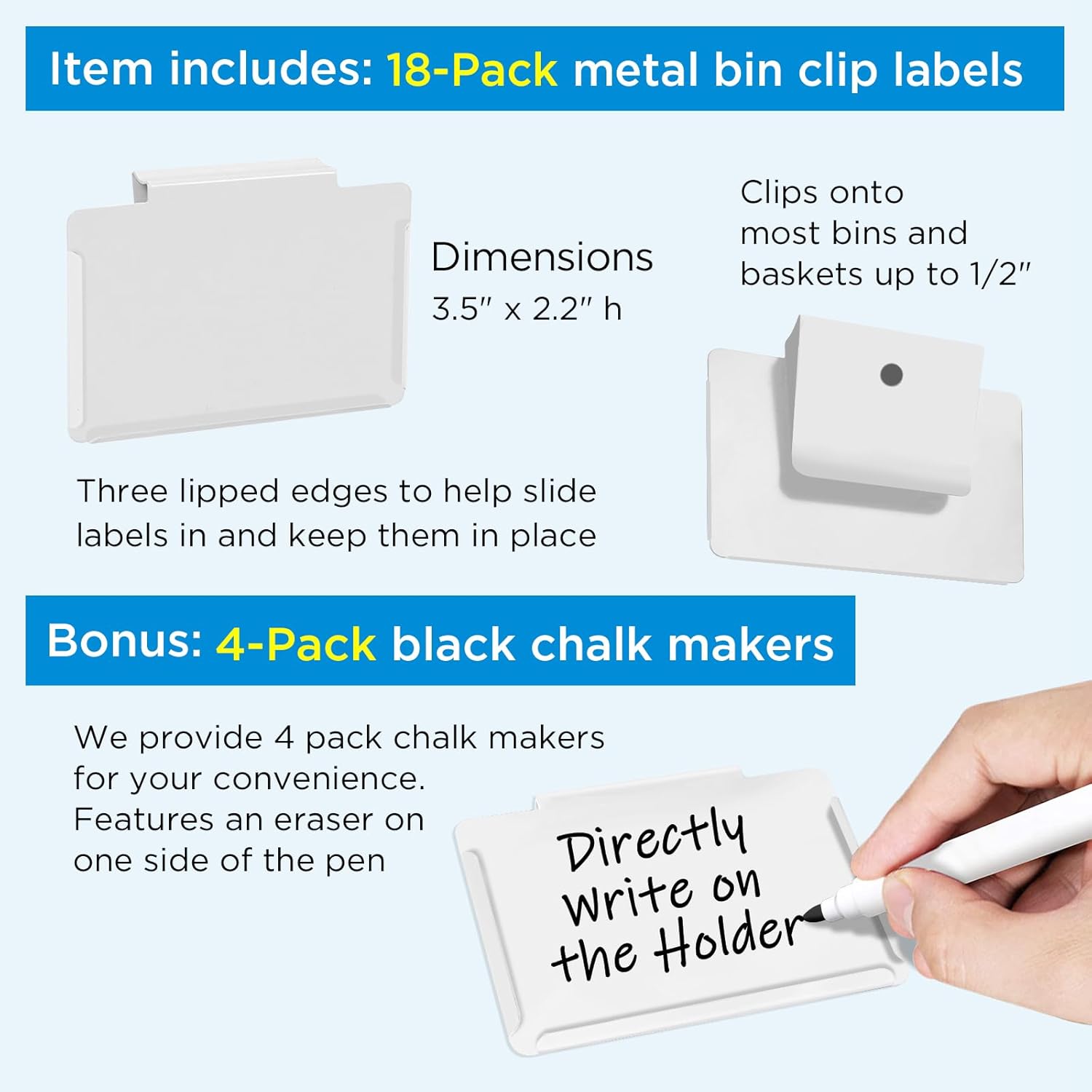 - PREMIUM & SMART PANTRY LABELS: Unique clip-on design is easily removable or repositionable. It is bendable to help you slip it over different types of storage bins, baskets, and boxes. Three lipped edges to help slide labels in and keep them in place. Made of premium metal and durable for a long time run. Its smooth surface provides better writing performance.