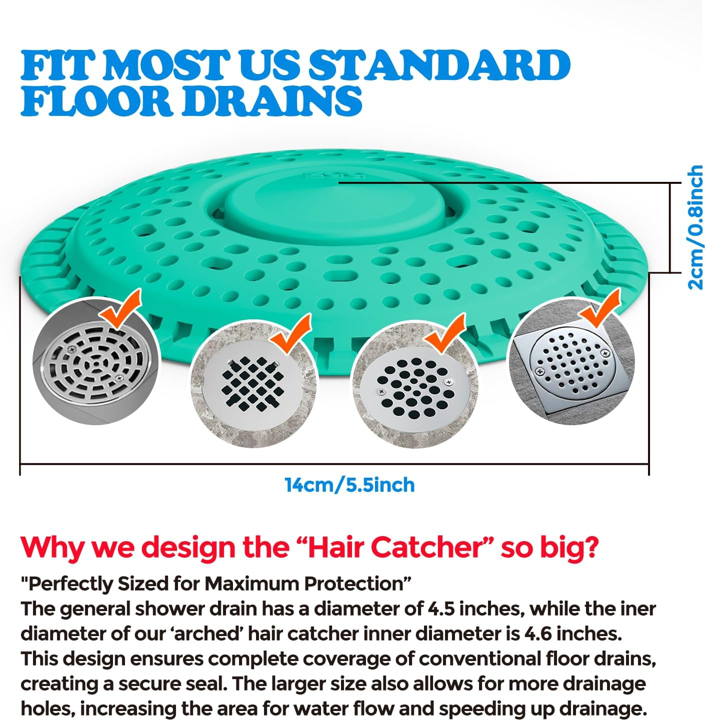 - 【Work for Flat Drains】It measures 5.5 inches (14cm) in diameter, suitable for most US standard floor drains of shower room, bathroom, laundry and kitchen, but don't recommend it for any curved surface. (Notice: it doesn't fit pop up drains)