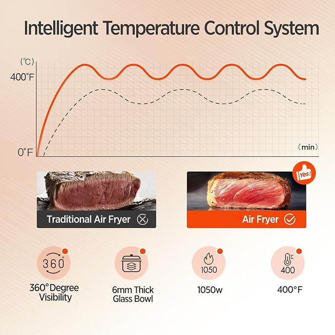 • ๐ŸŒช๏ธ Even Heat for Consistent Cooking: Engineered with a 360ยฐ hot air circulation system, this air fryer ensures that heat is evenly distributed around the glass bowl. This innovative design helps cook food uniformly, delivering delicious results with every use.
