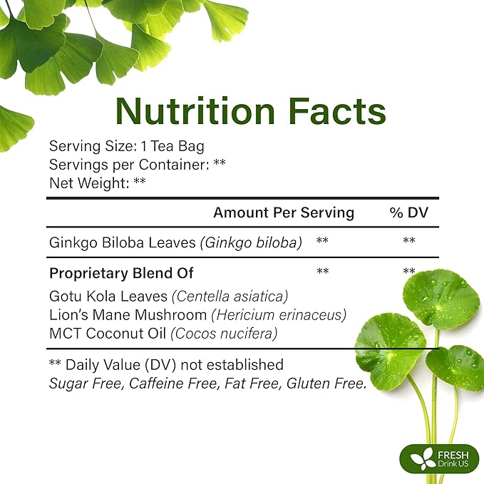 FreshDrinkUS, Memory Brain Booster Herbal Tea – 40 Tea Bags – Ginkgo Biloba, Gotu Kola, Lion's Mane & MCT Coconut Oil – Smooth, Earthy Flavor – Caffeine-Free – Daily Herbal Blend for Anytime Use