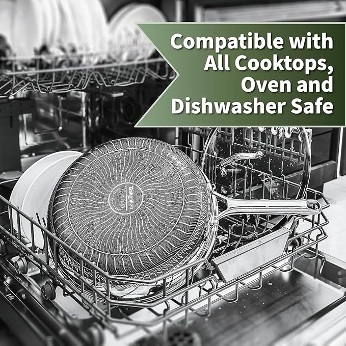 - Hybrid Nonstick and Black Ceramic Coating German Import Tech,heavy duty, this frying pan consists of three layers construction-two layers of stainless steel and one aluminum core.The newly honeycomb etching and black ceramic coating process are applied to the pan surface, which makes it truly non-stick, scratch-resistant and corrosion resistant, discolor will not occur. Free of PTFE, PFOA, PFAS,non toxic, durable and healthy.