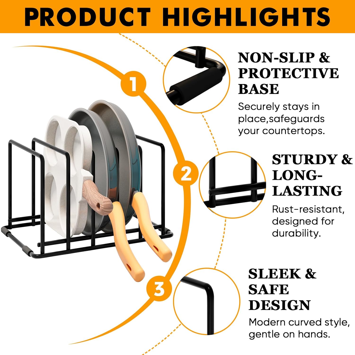- ๐๐ฎ๐ซ๐๐๐ฅ๐ ๐๐ญ๐๐๐ฅ ๐๐จ๐ซ ๐๐๐ฌ๐ญ๐ข๐ง๐ ๐๐ฌ๐! - Made of premium steel with non-slip feet and smooth edges, this organizer ensures stability and protects your cookware and surfaces.