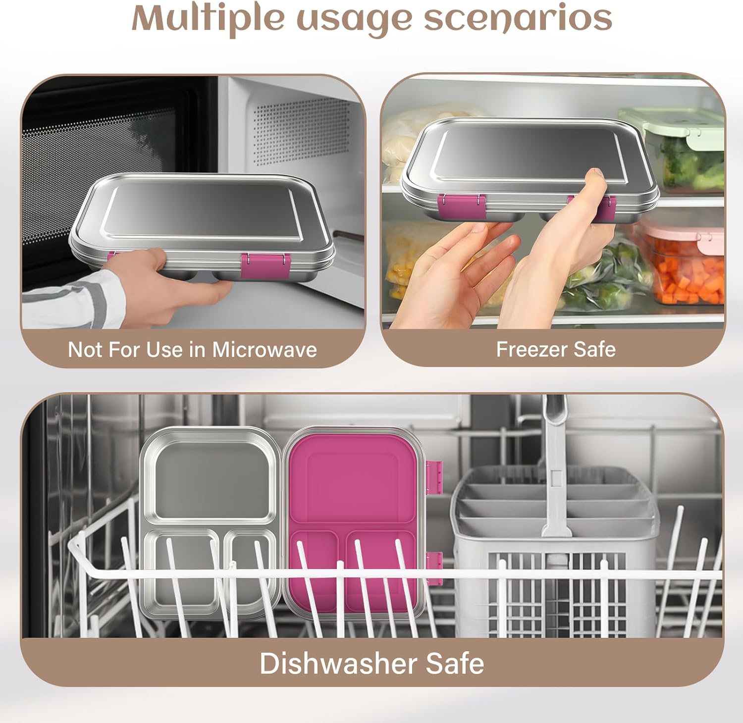- Leak-Proof Guarantee: This upgraded leak-proof stainless steel bento lunch box has been professionally designed to prevent leakage of thick condiments such as ketchup and salad dressing. Our advanced silicone sealing lid ensures food stays fresh and mess-free all day long. Perfect for kids who love to dip their veggies!