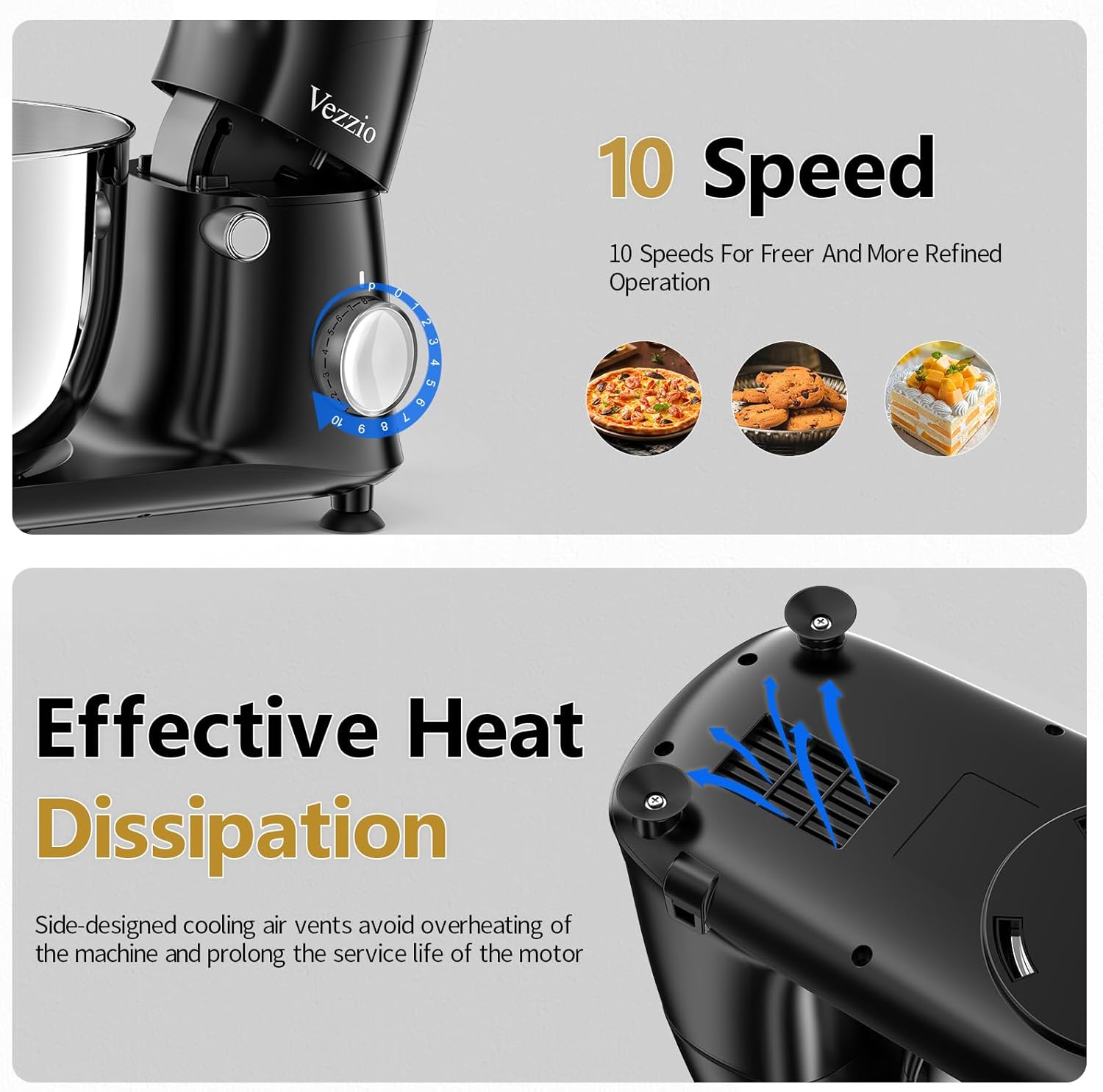 Vezzio Stand Mixer,6 Quarts,10-Speed Tilt-Head,Kitchen Food Mixer with Stainless Steel Bowl,Dough Hook,Whisk, Beater,Egg White Separator (Black)