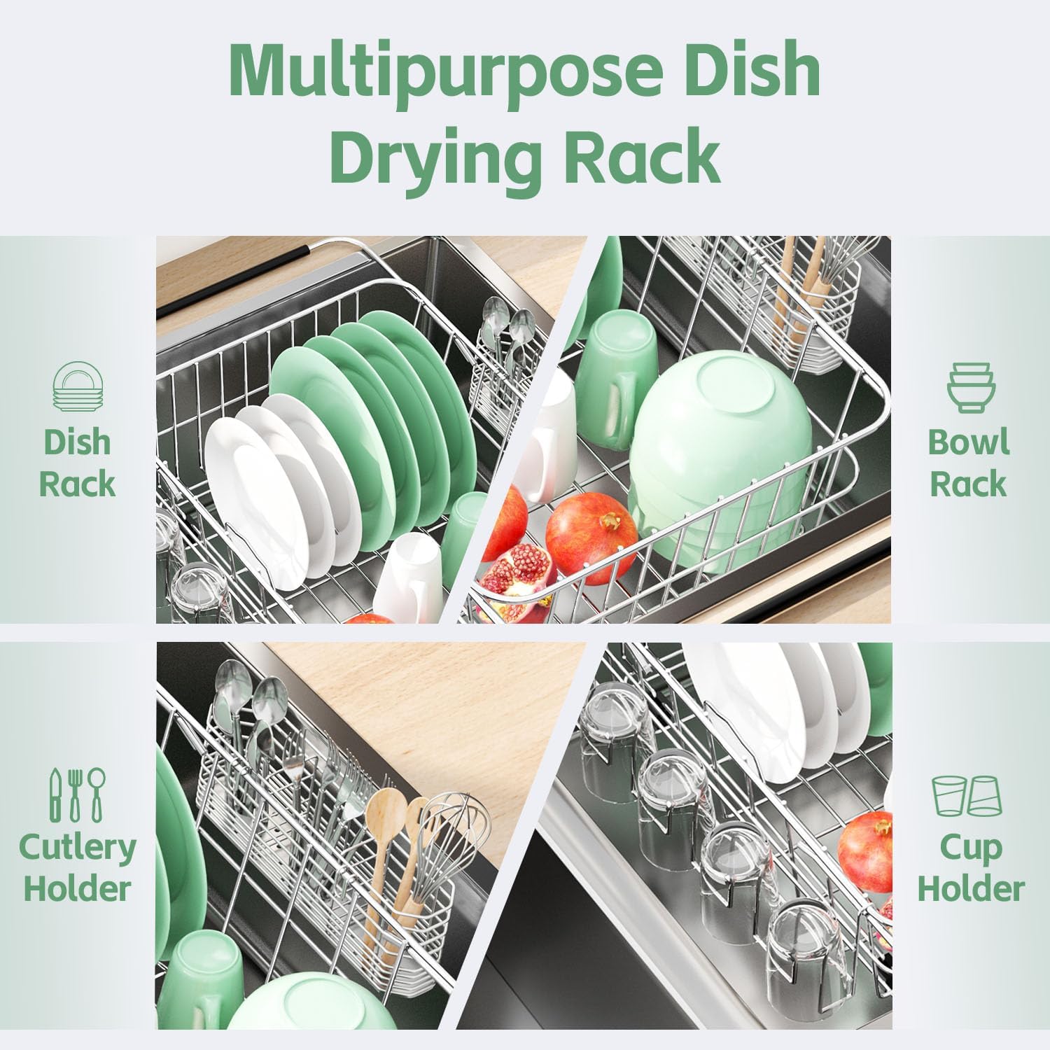 Dish Drying Rack in Sink, Extendable Stainless Steel Dish Drainers for Kitchen Counter, Anti-Rust Dish Dryer Rack with Utensil & Cup Holders, for Inside Sink, Over The Sink