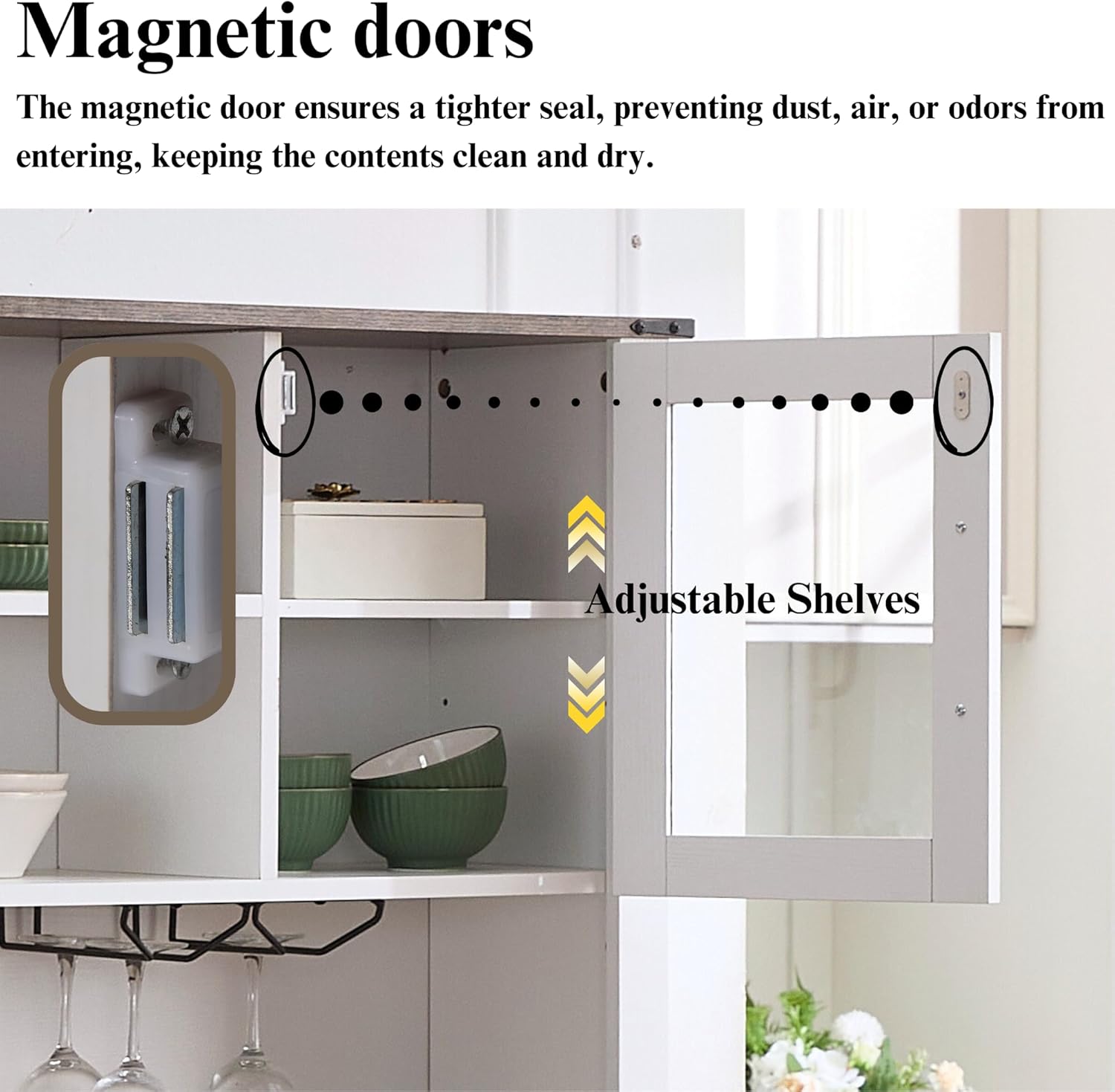 - Wine Glass Rack- Sliding Barn Doors- The two sliding barn doors feature a high-quality rail system, operating smoothly and quietly to save space while adding a retro-industrial touch. Inside, a spacious interior with three adjustable shelves accommodates wine bottles, glasses, or kitchen items, with the flexibility to fit standard-sized wine bottles for effortless storage