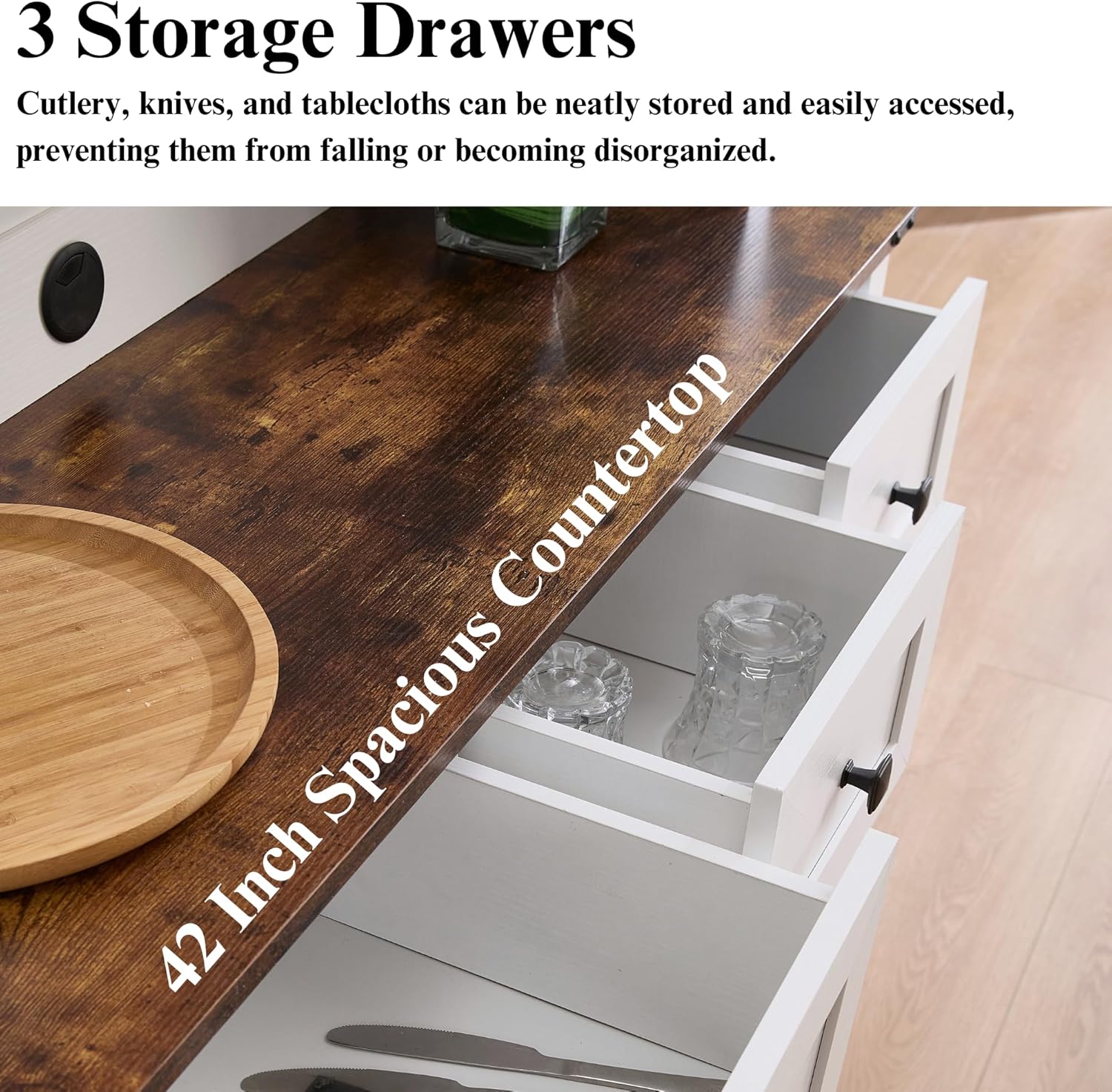- Ample Storage- This kitchen sideboard offers ample storage. The generous tabletop fits kitchen appliances, while 3 drawers store knives and cutlery. The 4-door storage cabinet has adjustable shelves with 3 height options for flexible storage. Aesthetically pleasing and practical, it enhances space utilization in the kitchen or dining room