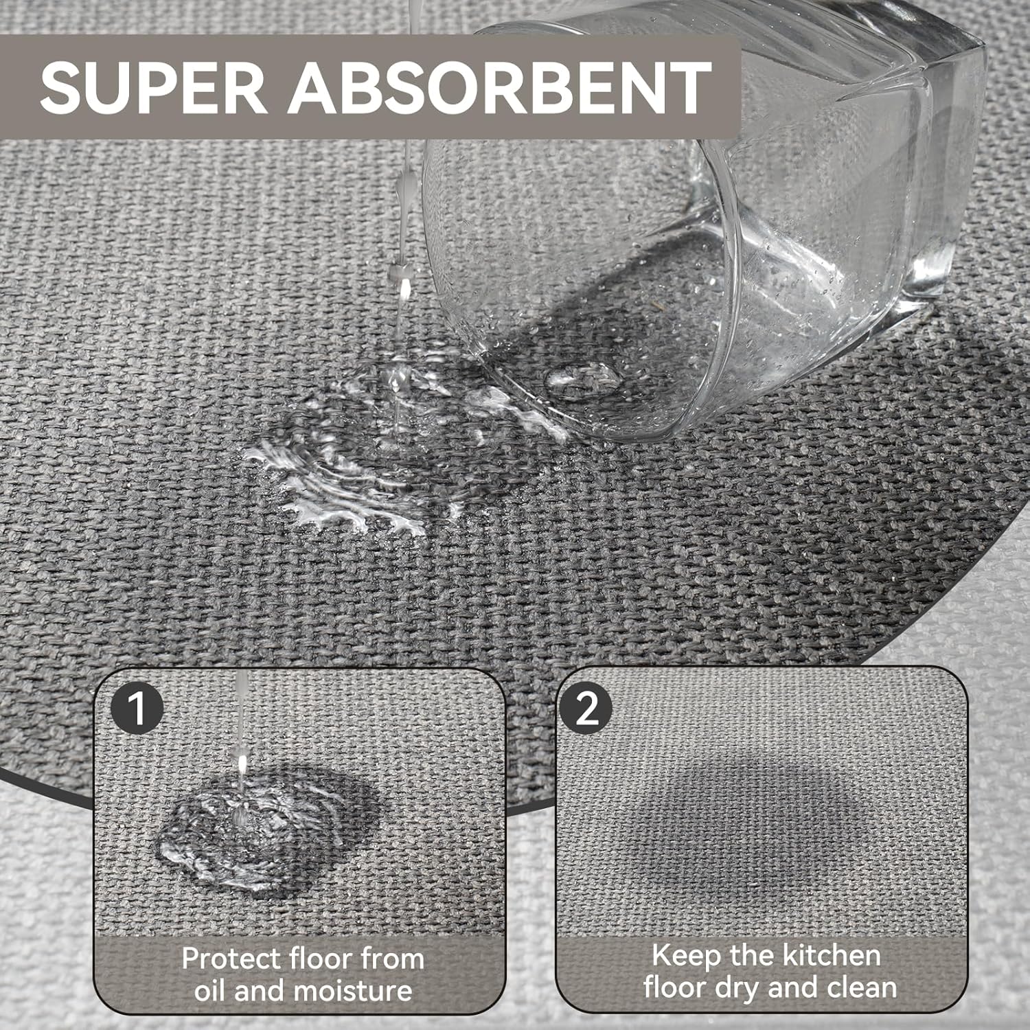 - Super Absorbent Quick Drying Kitchen Rugs - YDKGL kitchen mats is finished with a woven linen-look fabric that quickly absorbs dripping oil and water and easily handles spills and moisture. Good water absorption and stain resistance protects the kitchen floor from grease, moisture, sauces or food particles, keeping the kitchen tidy and adding an extra layer of safety to the kitchen.