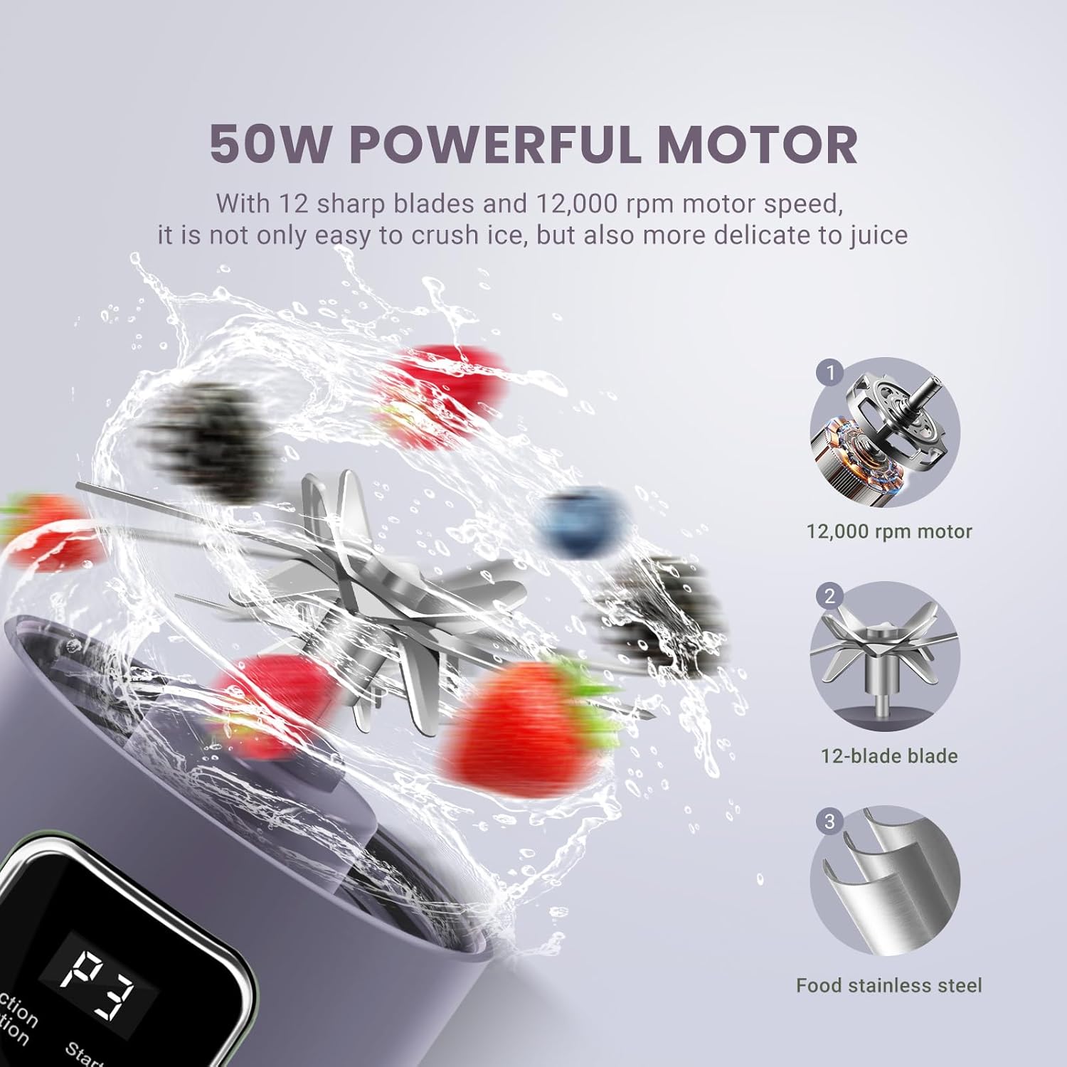 - 【Safety & Food-Grade 12 Blades 】Our Portable juicer made of high-quality food-grade, non-toxic ABS and 304 stainless steelFeatures an elegant hand-held M-cup lid design that not only looks beautiful but also allows for easy disassembly of the cup and machine.Features a robust 50W motor and 12 stainless steel blades spinning at 12,000 RPM.It can easily crush ice cubes and frozen fruits.Elevate your blending experience with convenience and speed.