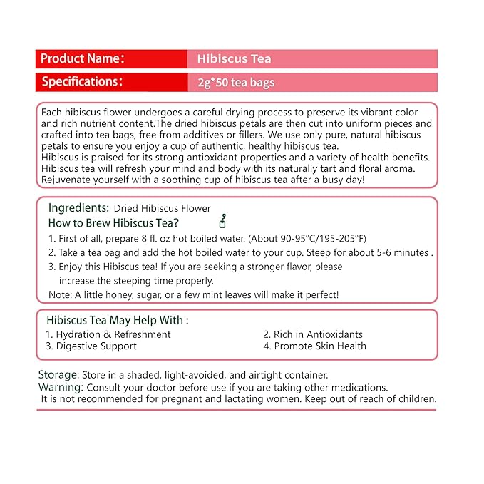 • 【Ease into Enjoyment】: Brewing hibiscus tea is easy: steep one hibiscus tea bag in boiling water for about 5-6 minutes. The longer it steeps, the stronger the flavor and color become. Sweeteners like honey or sugar can be added to taste.
