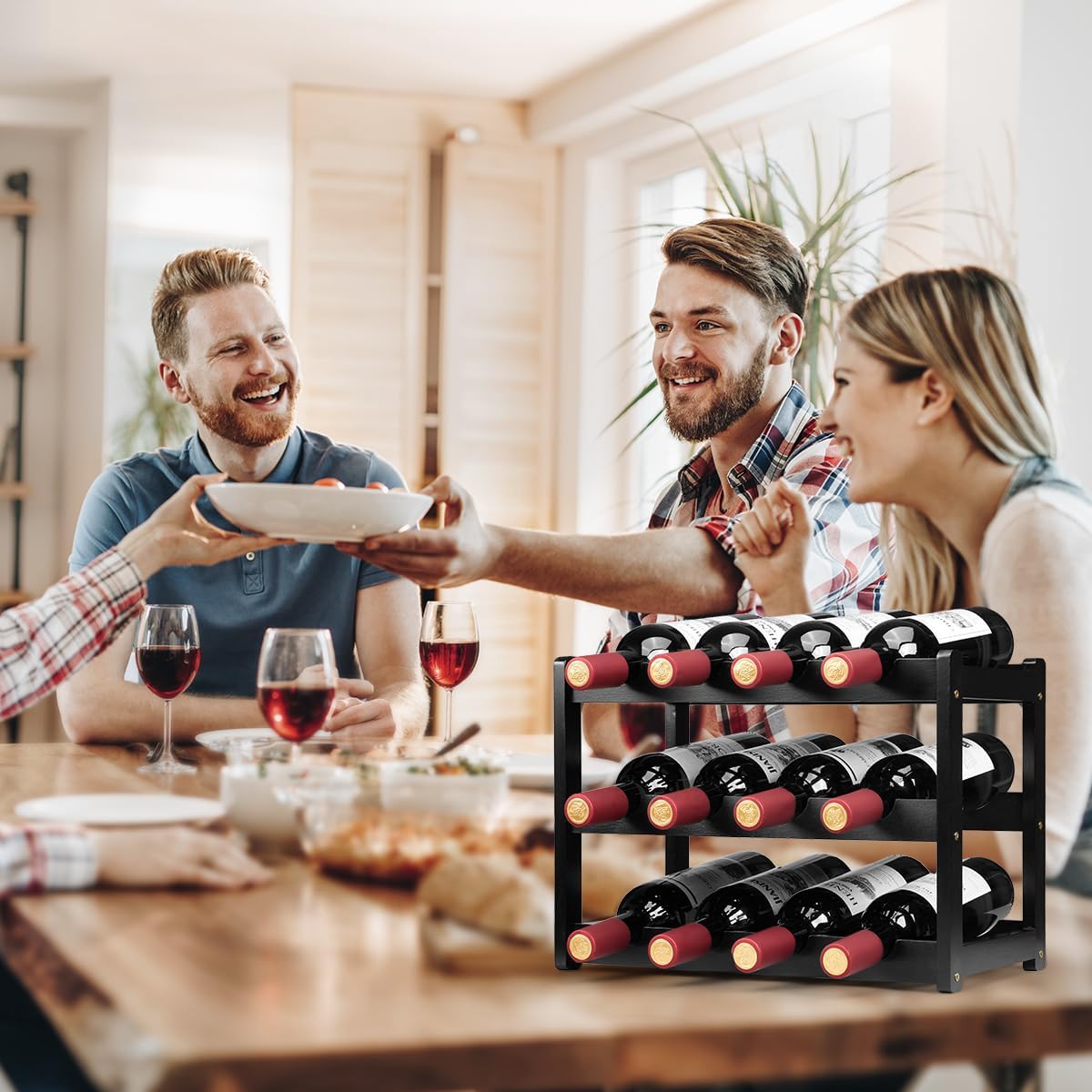 Bamboo Wine Rack, Sturdy and Durable Wine Storage Cabinet Shelf, Wine Racks Countertop for Pantry - 3 Tiers 12 Bottle Wine Rack, Black