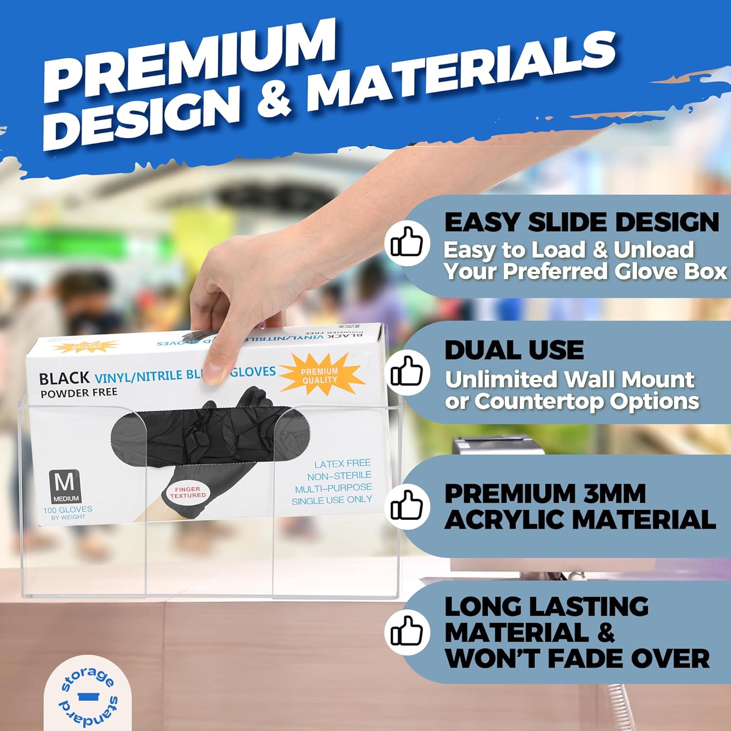 - Dual-Use Gloves Holder Flexibility - Easily mount our acrylic glove holder on the wall with the included hardware or place it on a countertop with included clear bumpers for stability. A must-have for any workspace.