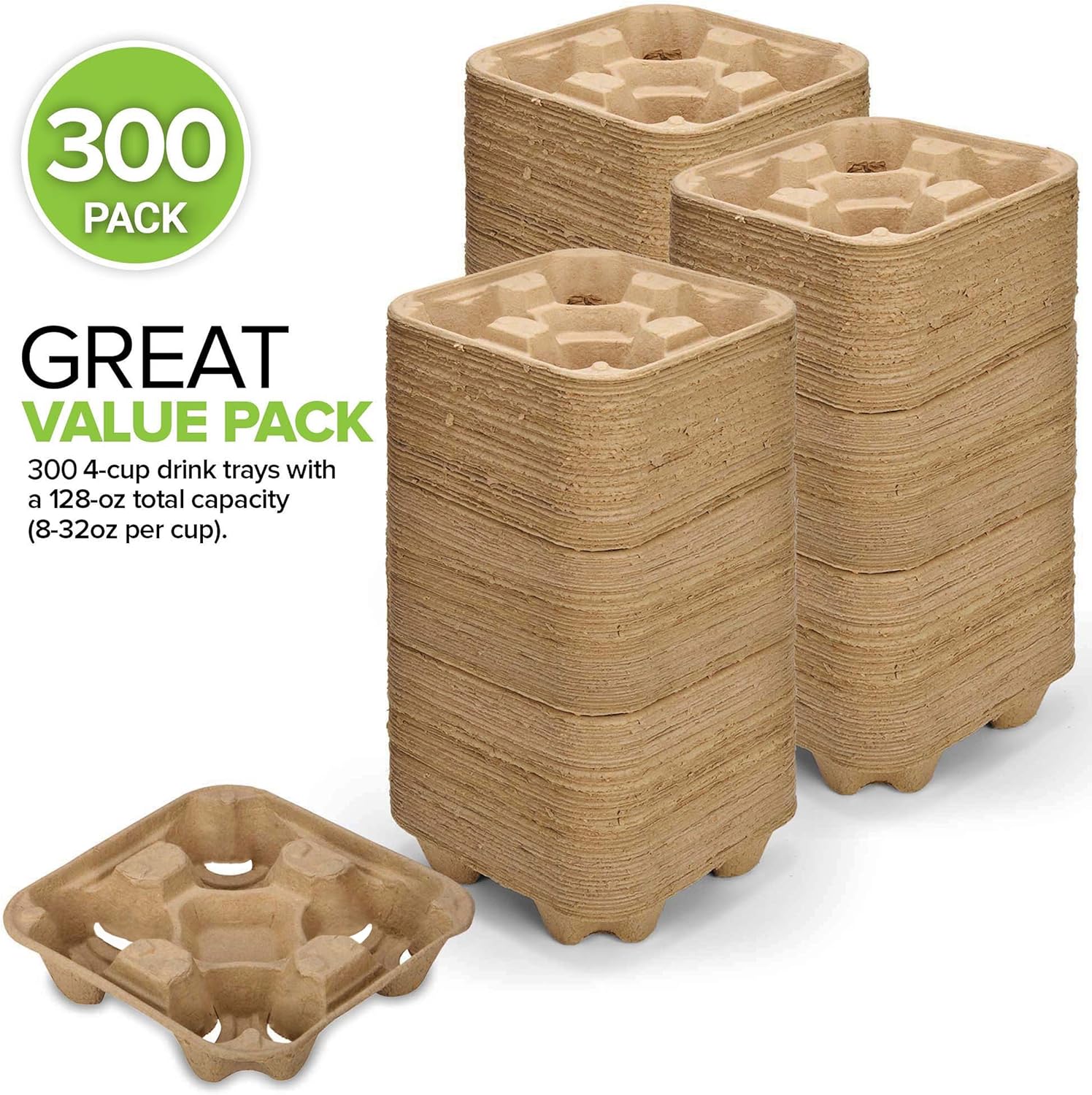 - Great Value Pack: You get a value pack of 300 4-cup drink trays with a 128-oz total capacity (8-32oz per cup). Dimensions: Approximately 8 ¾ x 8 ¾ x 1 ¾ inch trays.