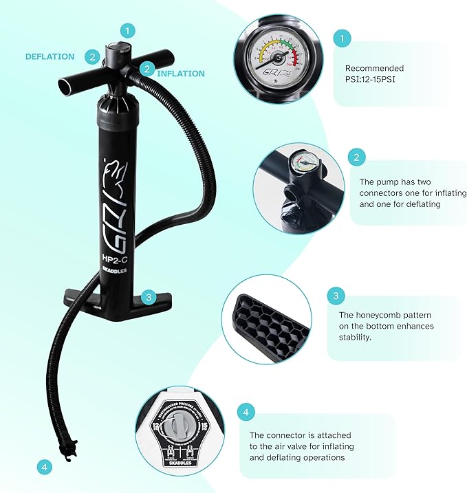 • 【All-in-One SUP Accessories Kit】 Each SKADDLES paddle board comes with a high-efficiency manual air pump, adjustable paddle, ankle safety leash, waterproof phone pouch, repair kit, and removable fins — everything you need for easy setup and worry-free paddling adventures.