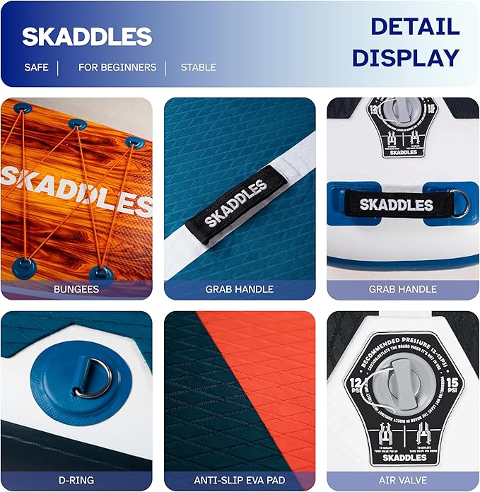 • 【High-Quality Inflatable Paddle Board with Trusted Support】 Crafted from high quality PVC with anti-slip EVA deck pad, SKADDLES paddle board offers excellent durability and comfort. We stand by our quality — enjoy a 30-day free return and extended support for added peace of mind.
