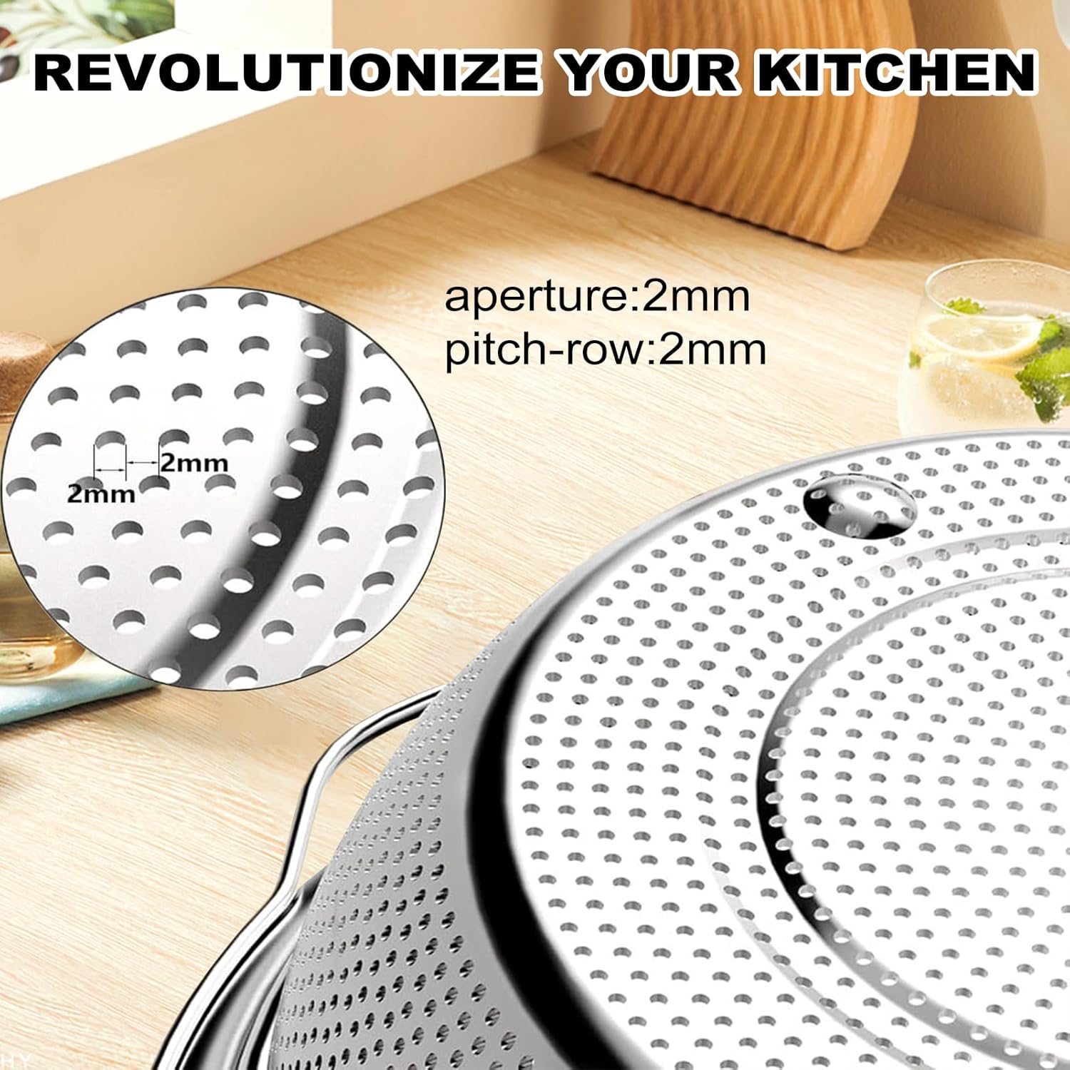 - Effortless Draining with 2mm Precision Holes: Designed with uniform 2mm perforations, this colander set ensures quick, efficient water drainage while rinsing fruits, vegetables, or dishes.