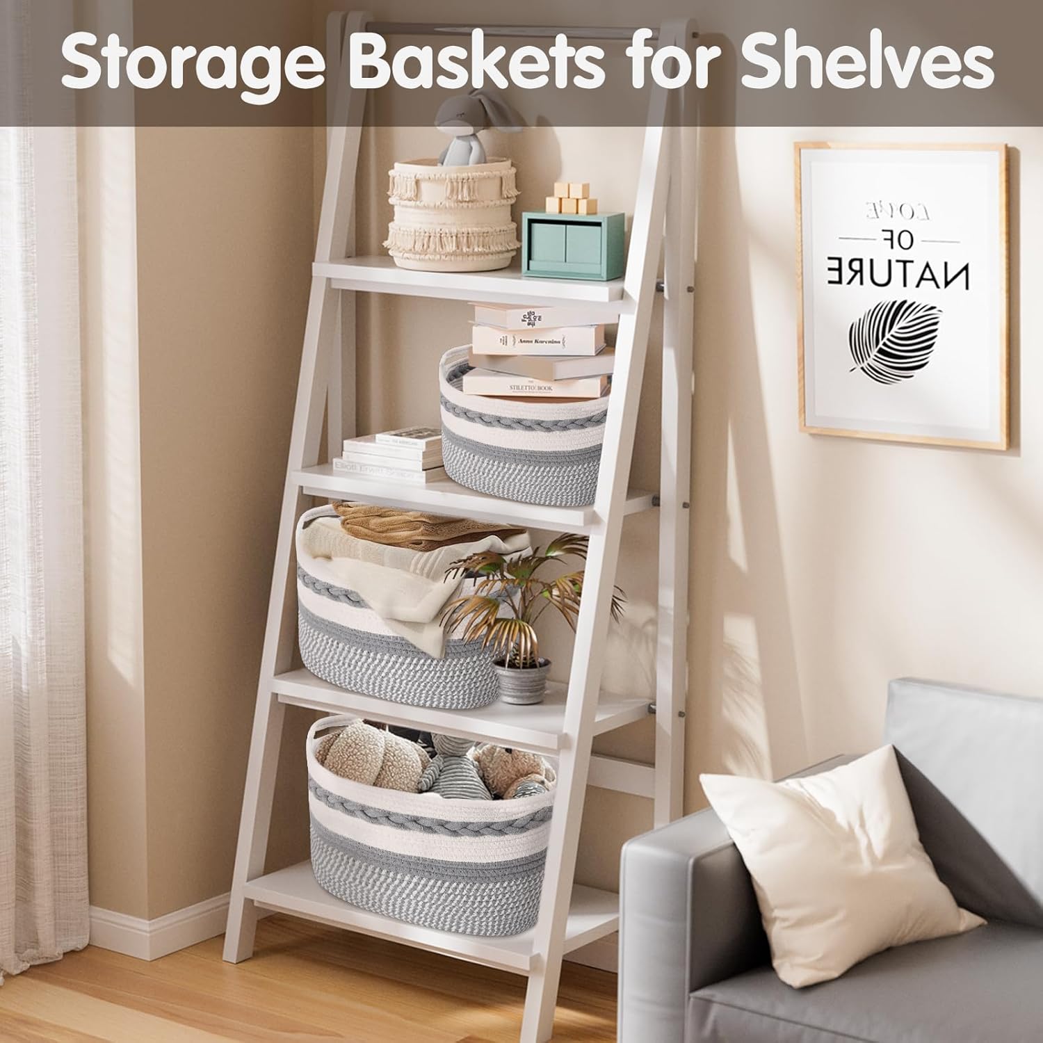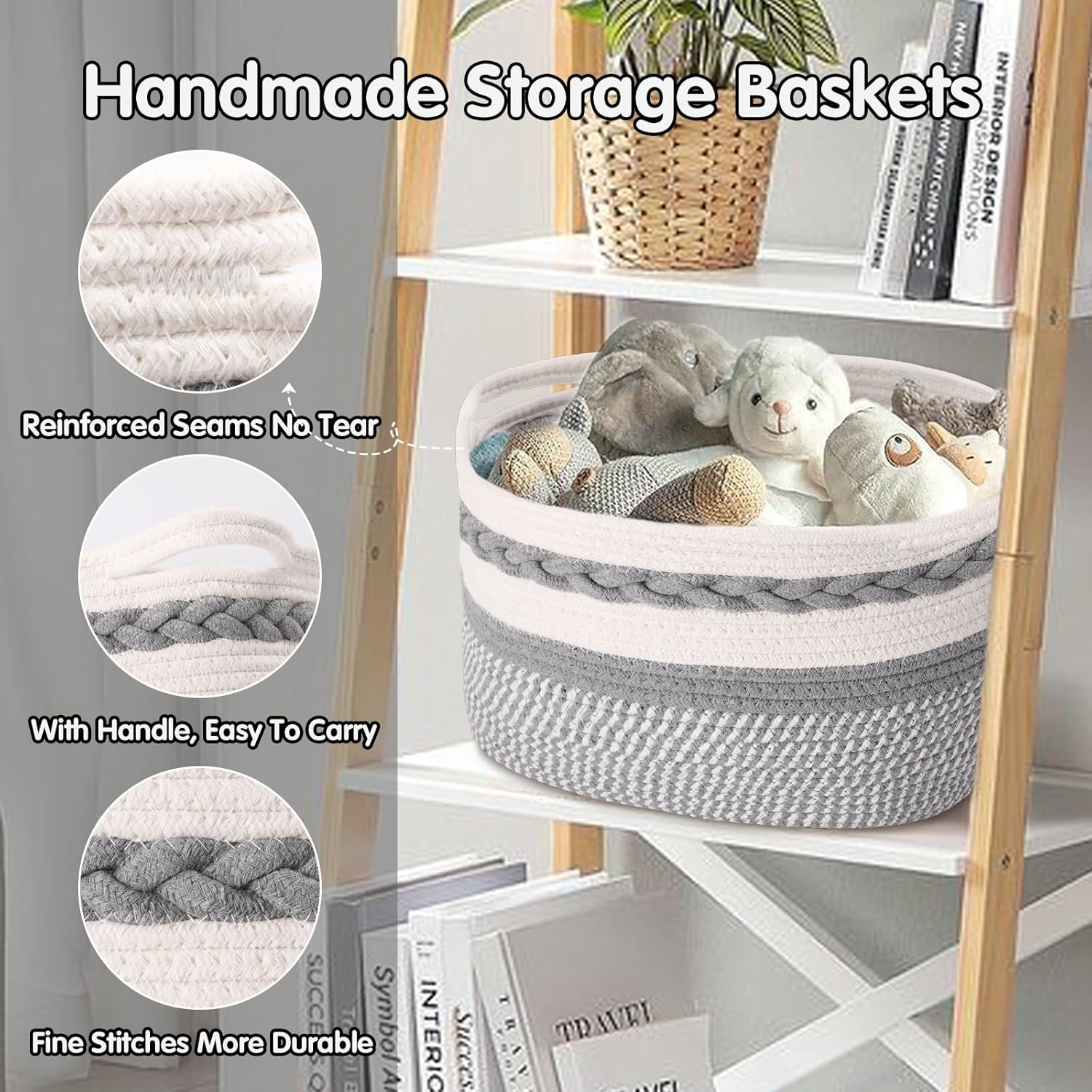 Woven Storage Basket, 3 Pack Grey Rope Basket for Shelves, HandWoven Cotton Rope Basket with Built-in Handles and Labels for Bathroom, Bedroom, Laundry, Pantry, Shelves