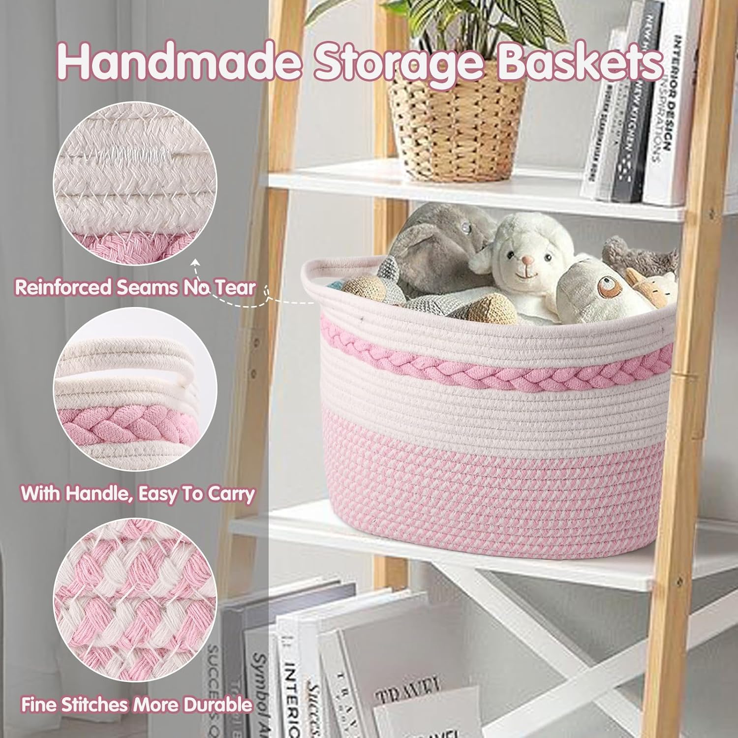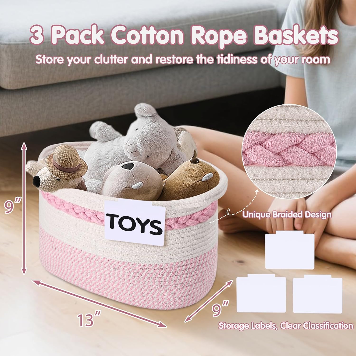 Woven Storage Basket, 3 Pack Pink Rope Basket for Shelves, HandWoven Cotton Rope Basket with Built-in Handles and Labels for Bathroom, Bedroom, Laundry, Pantry, Shelves