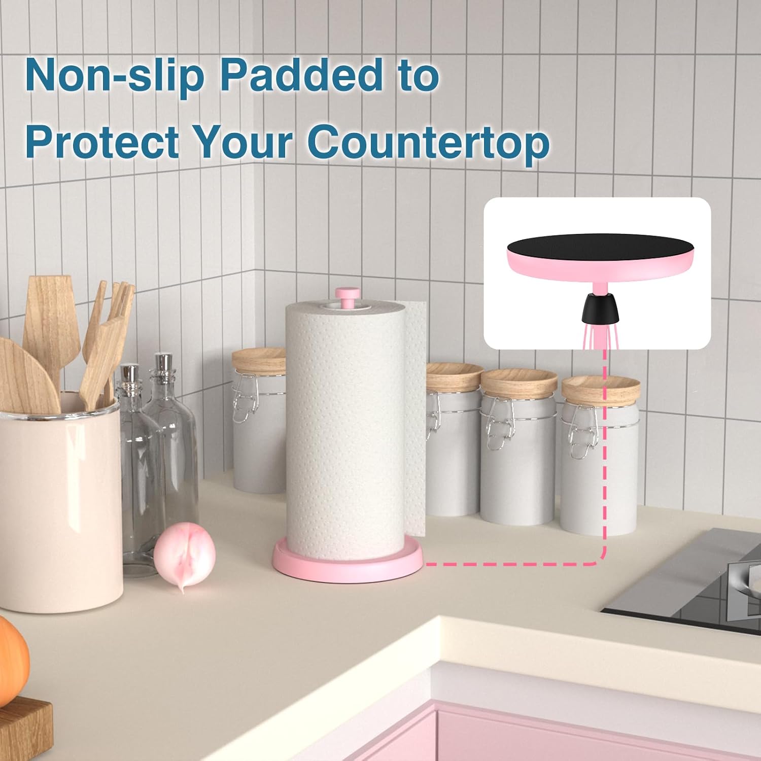 - STUDY WEIGHTED BASE WITH NON-SLIP PAD:With weighted base to make sure that paper towel holder pink won't shake when you tearing the paper. Non-slip EV pad at the bottom, won't scratch your desktop. Outstanding kitchen decor and accessories!