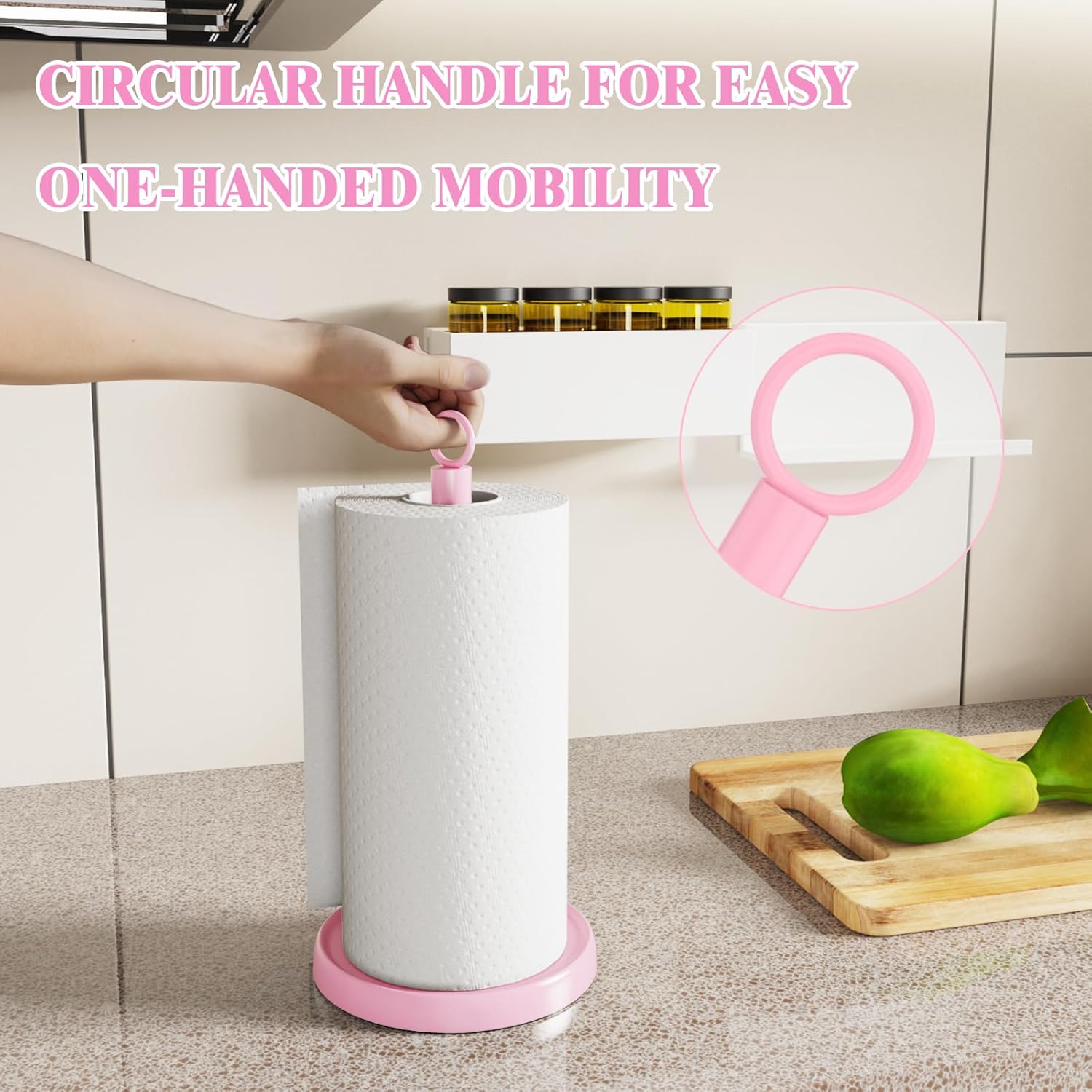 Pink Paper Towel Holder Countertop, Pink Kitchen Accessories Decor, One-Handed Tear, Stainless Steel, Weighted Base, Ring Paper Towel Holder Stand with Ratchet System for Kitchen Farmhouse Essentials
