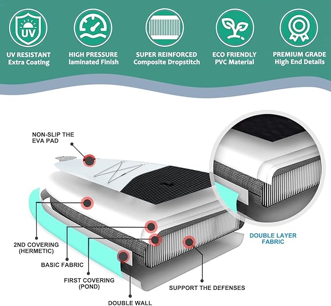 • πŸ›‘οΈMilitary-Grade Durability & Safety: Built with 0.9mm reinforced PVC and dual-layer V-drop stitch technology, the blow up paddle board withstands sharp impacts and UV exposure. The 4mm cross-vertical EVA deck delivers exceptional anti-slip performance, even during high-intensity movements. Rated for 450 lbs, it retains structural integrity under heavy loads, making it ideal for fishing, yoga, or multi-hour expeditions.