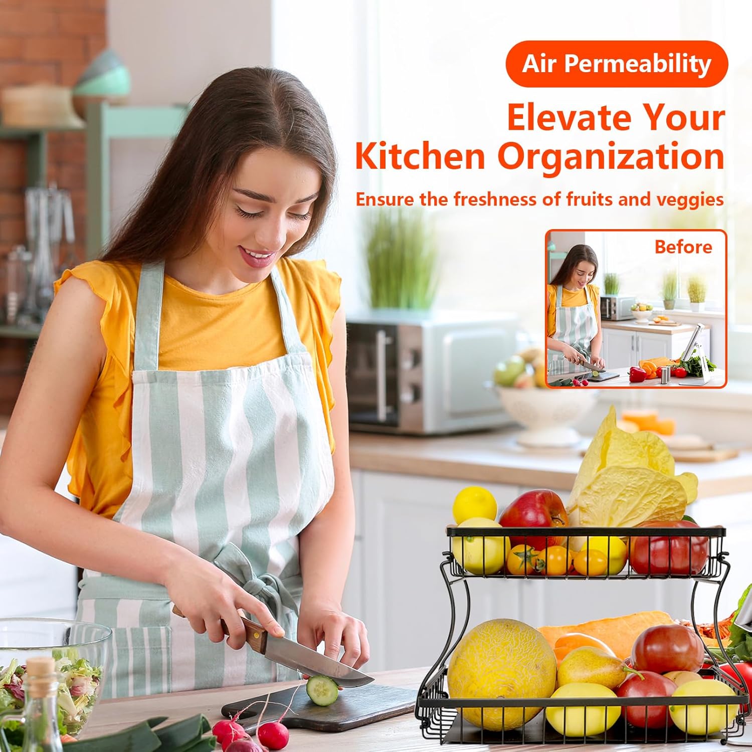 - β "Metal two tier fruit basket with ergonomic Wood Handles - Comfortably carry heavy loads of citrus fruits and veggies to picnics, kitchens, or grocery stores"