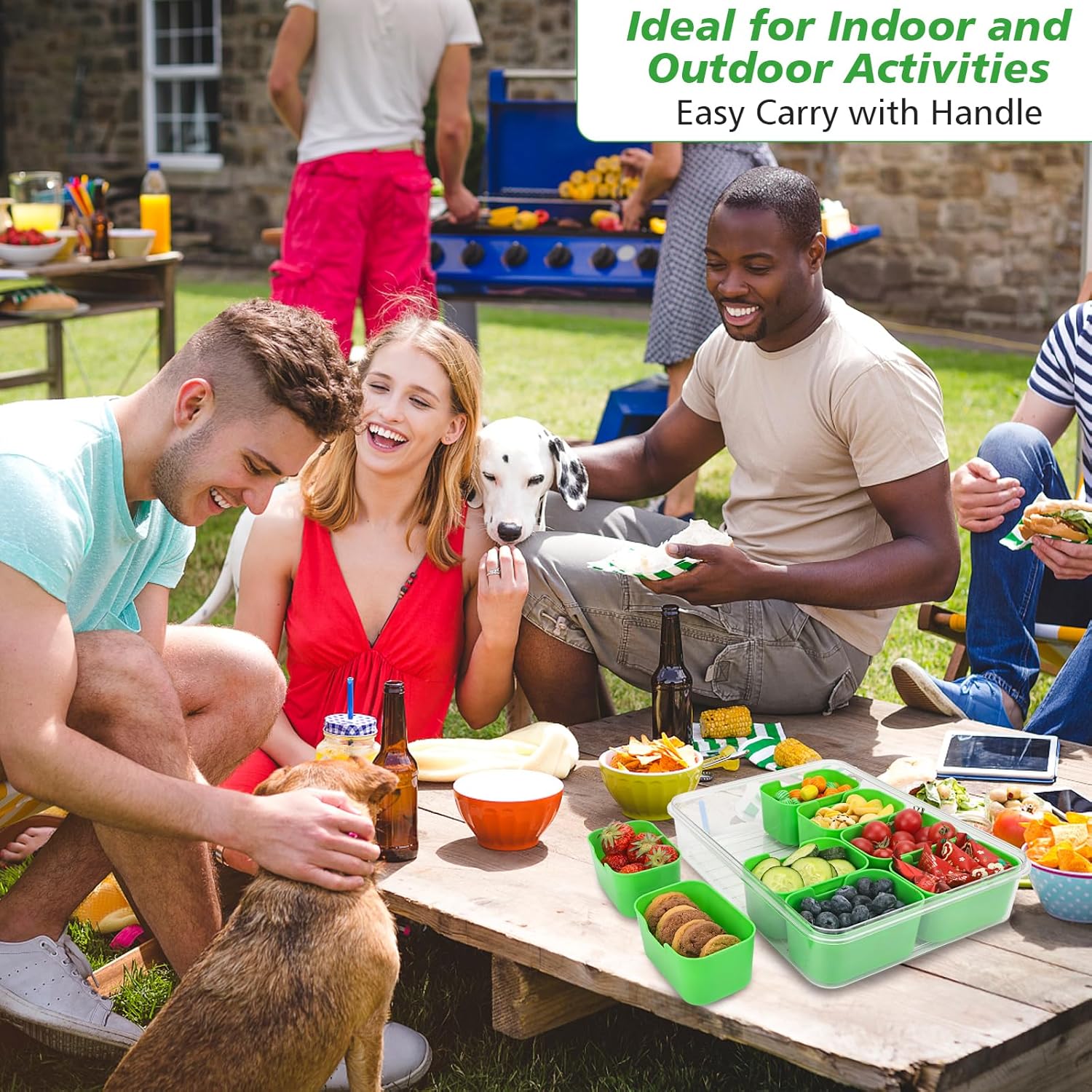 - 【Portable Charcuterie Container】The divided serving tray with lid and handle is stackable for easy carry, perfect for indoor and outdoor use like gatherings, parties, kitchen use, movie night, watching ball game and beach camping, picnic and travel for portable size.