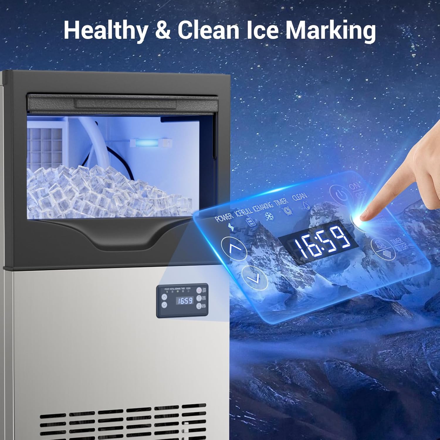 - High-Performance Ice Production: The commercial ice maker, capable of producing 100 lbs/24H, efficiently fulfills your daily ice cube requirements. This 15inch ice machine produces within just 8-15 minutes. If you regularly buy ice bags from stores, this machine can quickly pay for itself in under a week.