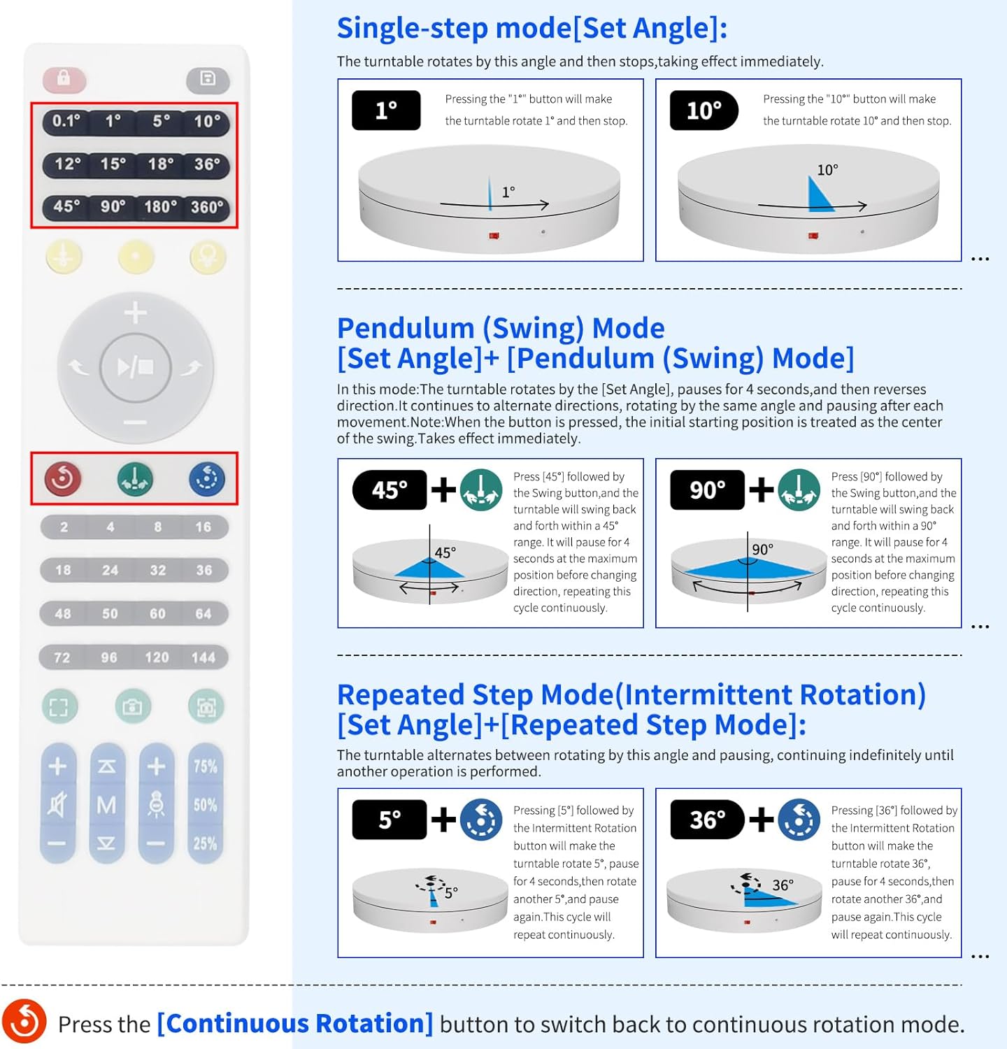 - 【The Large Electric Turntable Supports five rotation modes】: 【Continuous Rotation Mode】for Live Video Show.【Single-Step Mode】for Product Display and Live Demonstration.【Repeated Step Mode】 for Automated Product Display .【Multi-step Within One Circle Mode】for 360-Degree Multi-Angle Photography and 3D Scanning. 【Pendulum (Swing) Mode】 for Automatic Multi-Angle Front-and-Back Product Display. The intelligent multi-step within one circle mode makes shooting more streamlined and automated