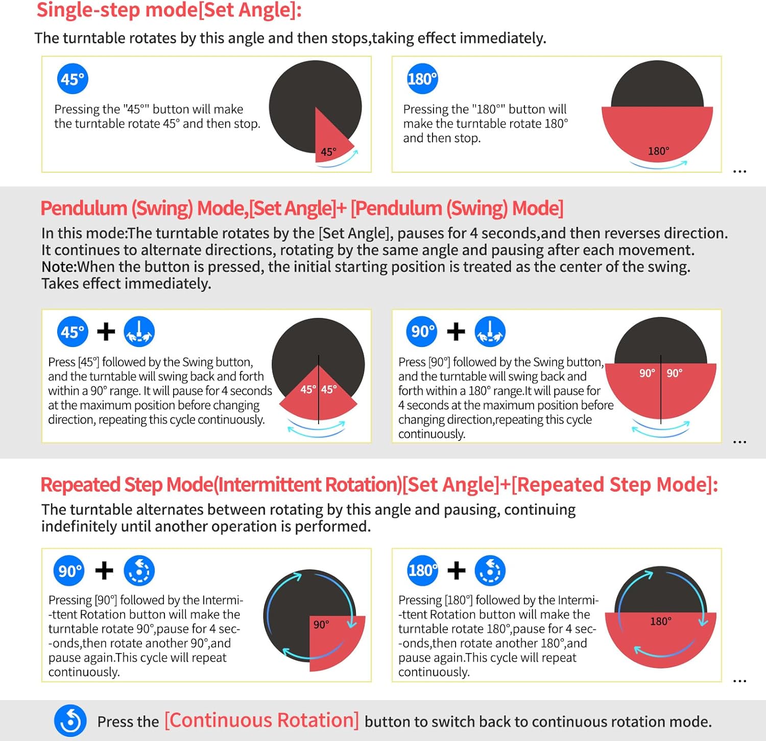 - 【The motorized lazy susan Supports remote control of four rotation modes】: Continuous rotation. Single-step rotation at 45°, 90°, and 180°. Repeated step rotation at 45°, 90°, and 180°. Pendulum (swing) rotation at 45°, 90°, and 180°. Allows remote control for both clockwise and counterclockwise rotation. The display stand supports remote control for start/pause and speed adjustment (increase/decrease).