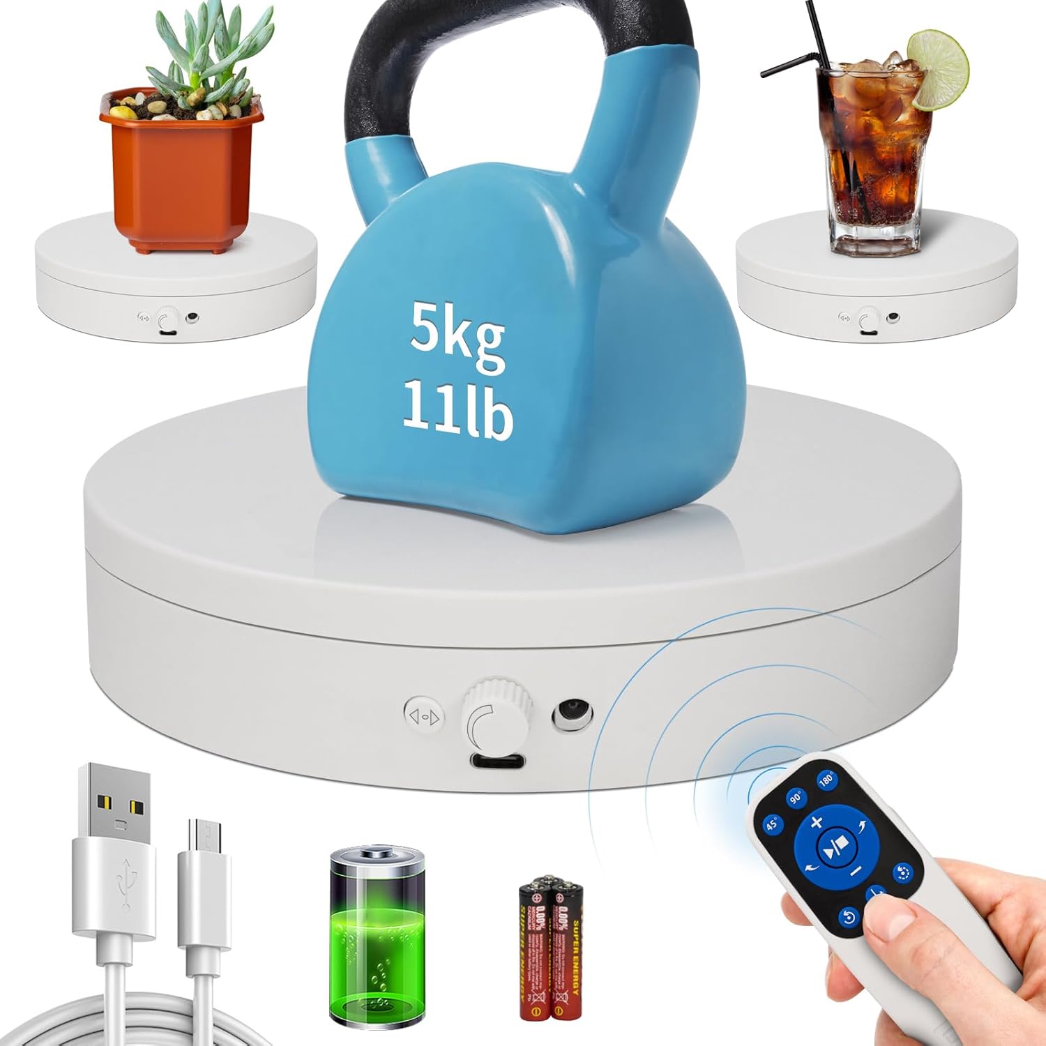 - 【Multiple professional display methods】:The diameter of the motorized rotating display stand with remote is 15cm/5.91inches, with a load-bearing capacity of 5 kilograms/11 pounds. The speed range is 20-60 sec/rev (±3sec). The speed can be adjusted through a knob or remote control. The bottom of the photography turntable is equipped with anti slip foot pads, which can come into contact with slippery surfaces.
