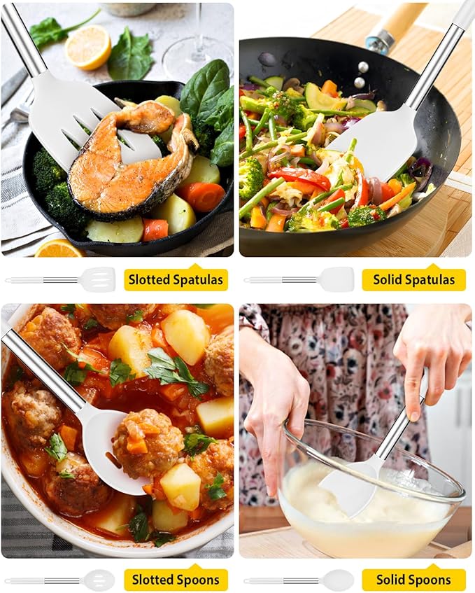 - Thoughtful Design : The good-quality 18/8 stainless steel keeps you away from the trouble of kitchen utensils rusting or breaking; This anti-scald silicone handle is not easy to conduct heat and is more comfortable to hold than traditional utensils