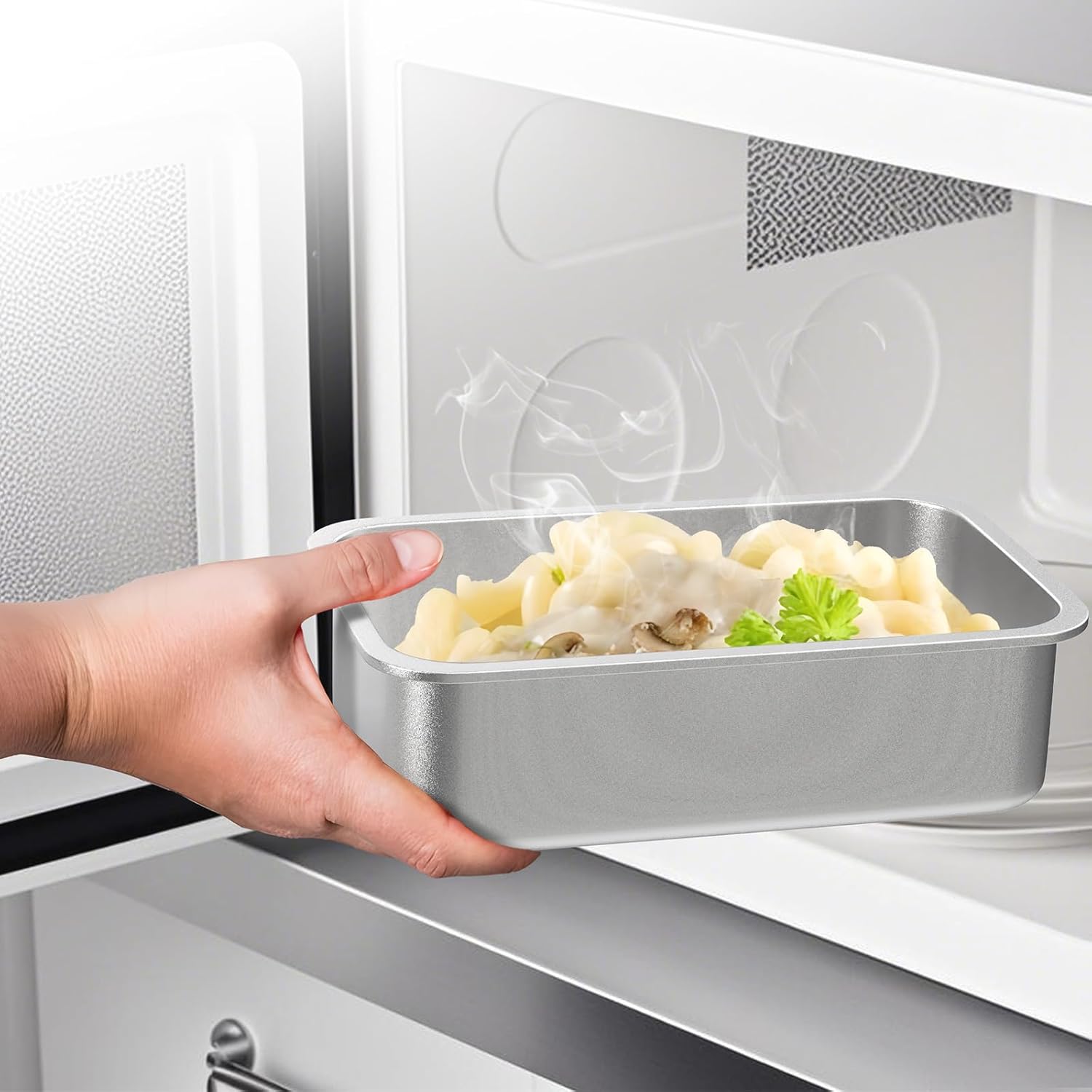 - From Microwave to Table: The smooth curved stainless steel design makes it compatible with microwave (Open the lid: microwave mode power <800w, heating <3 minutes), and also suitable for ovens, refrigerators, and dishwashers