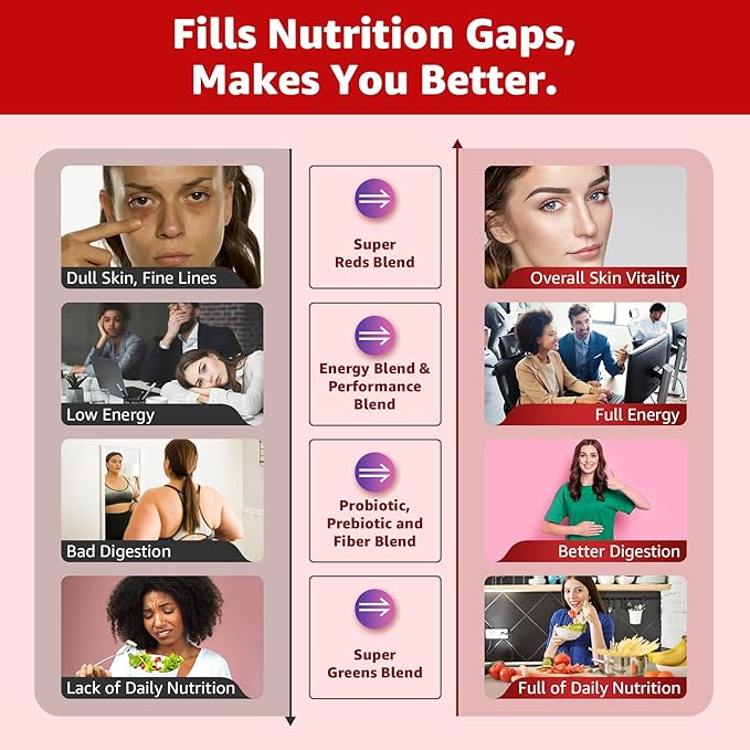 • Fuel Your Body with Nature’s Best: Super Reds & super green gummy combines over 40 superfoods and antioxidant-rich fruits—like beetroot, pomegranate, cranberry, goji berry, and açai berry—packed with polyphenols to support he♡rt, circulati♡n, and cognitive health. Plus, our Super Reds and greens supplement also contain super greens and adaptogenic ingredients. Together, they help boost energy production, keeping you sharp and focused all day!