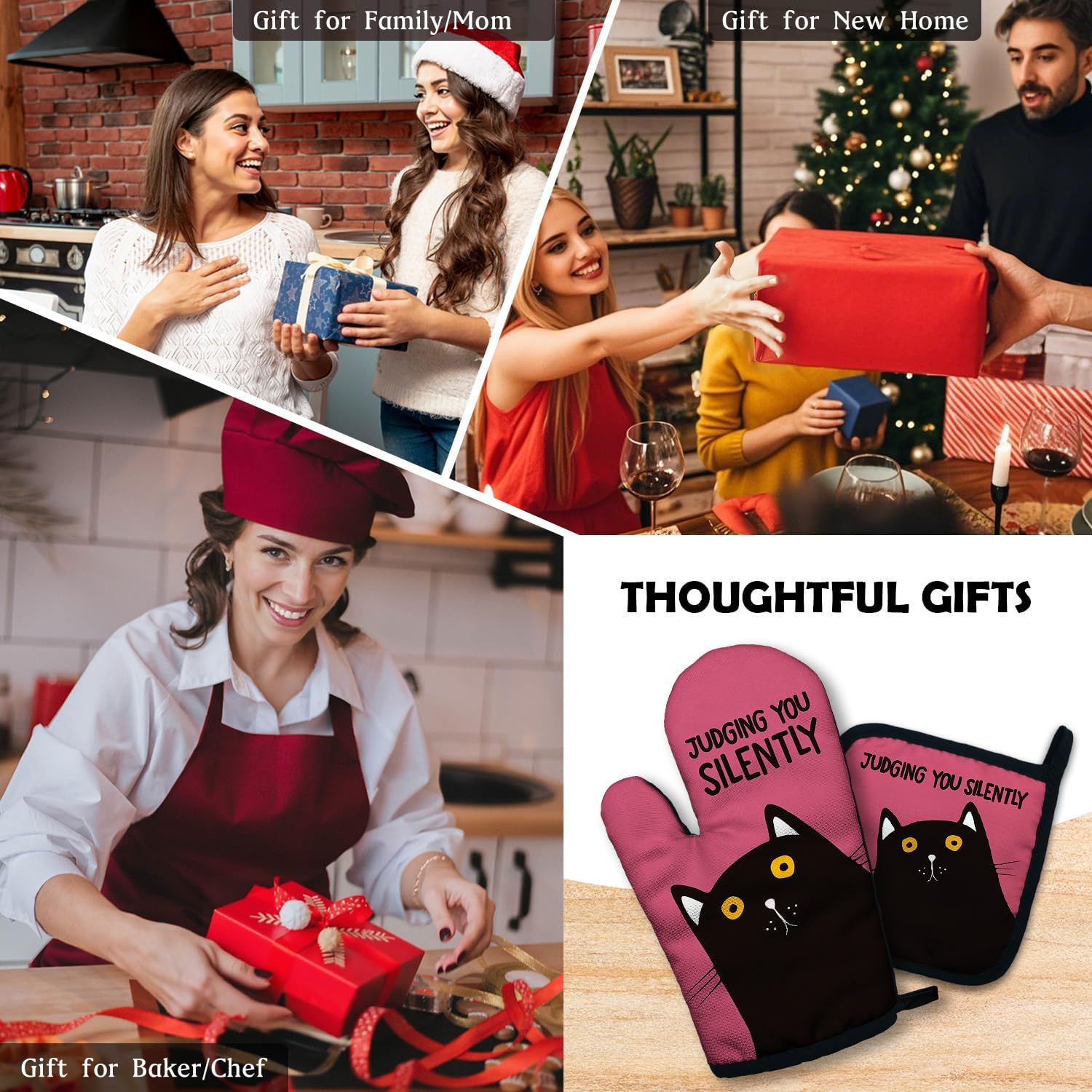 ZHANTUONE Judging You Silently Funny Heat Resistant Oven Mitts and Pot Holders Set with Silicone Non-Slip, Cute Cat Cooking Baking Gadgets, Gifts for Mom Aunt Sister BFF Cat Lover