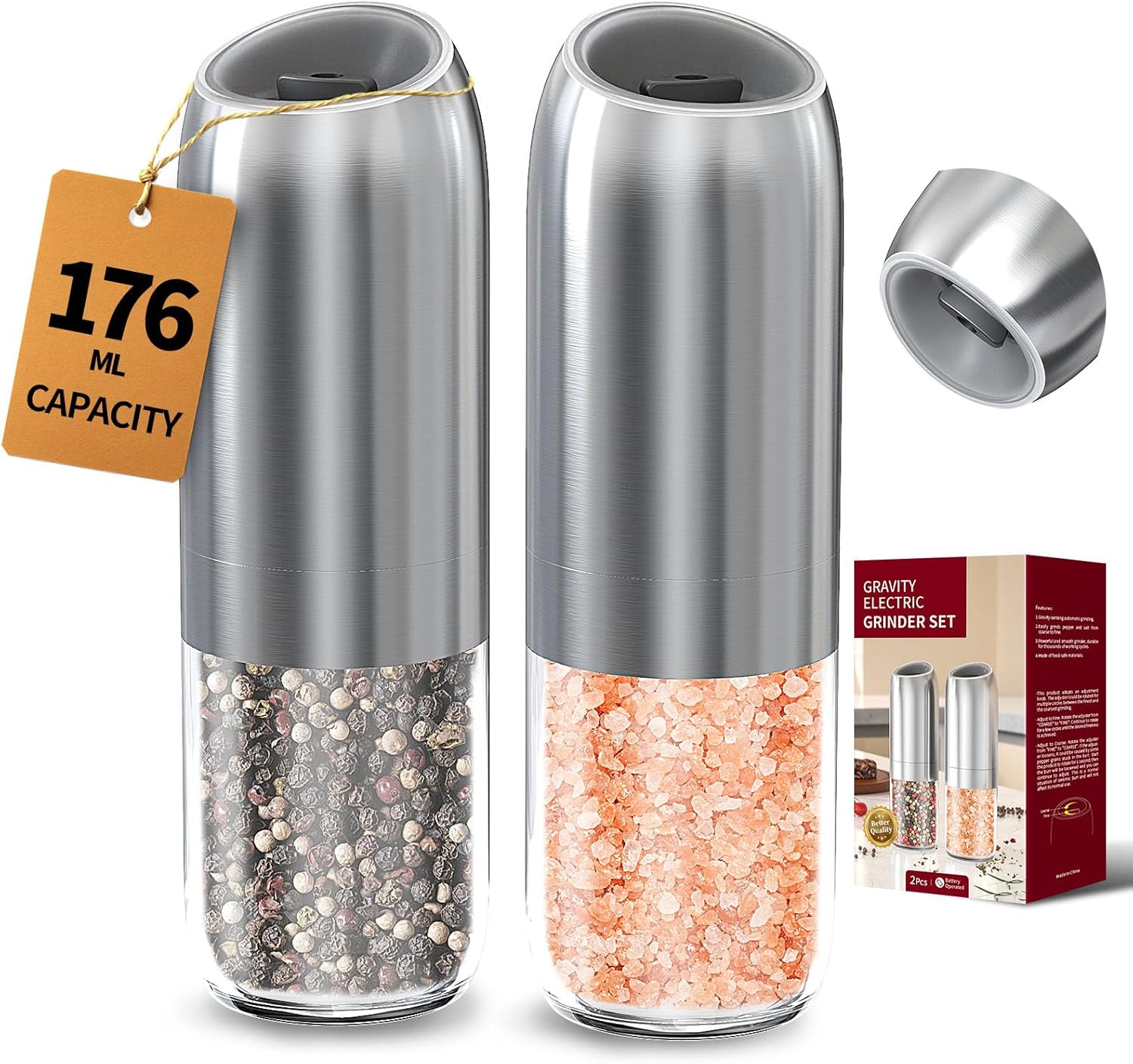 - Smart Grinding with Gravity Sensor - Experience effortless one-handed operation with smart gravity sensor technology. Simply tilt the electric pepper grinder over your dish, and it automatically starts grinding, eliminating the need for buttons or manual twisting. Perfect for busy chefs or those with limited grip strength, this feature ensures precise control and fresh seasoning every time