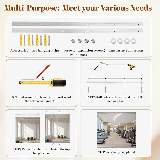 • Space-Saving Room-Brightening: Wall Mounted home gym mirror full length visually expand your home gym space while enhancing light. Perfect for garages, or basement gyms