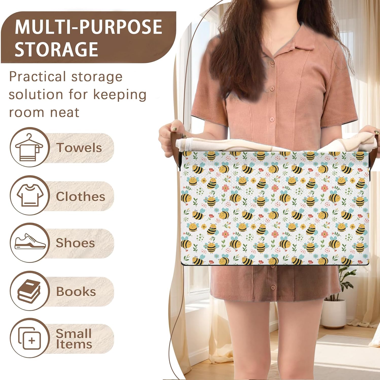 Honeybee Floral Storage Basket Large 17x11.5x10.5 Inche-Collapsible Fabric Organizer Bin with Handles for Garden Decor, Nursery, Spring Theme-Decorative Hamper with Botanical Insect-Single Pack