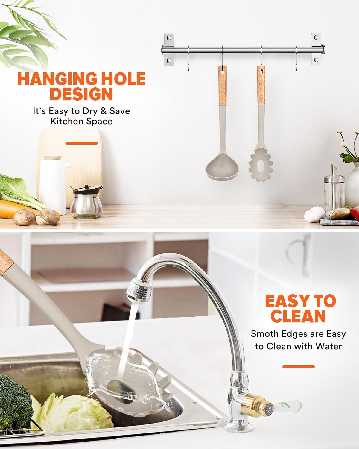 Pasta Fork and Ladle Set, Perfect for Serving Hot Soup, Stirring, and Sauce Pasta, BPA-Free Matte Silicone, Wood Handle Spaghetti Spoon for Nonstick Cooking Surfaces (Khaki)