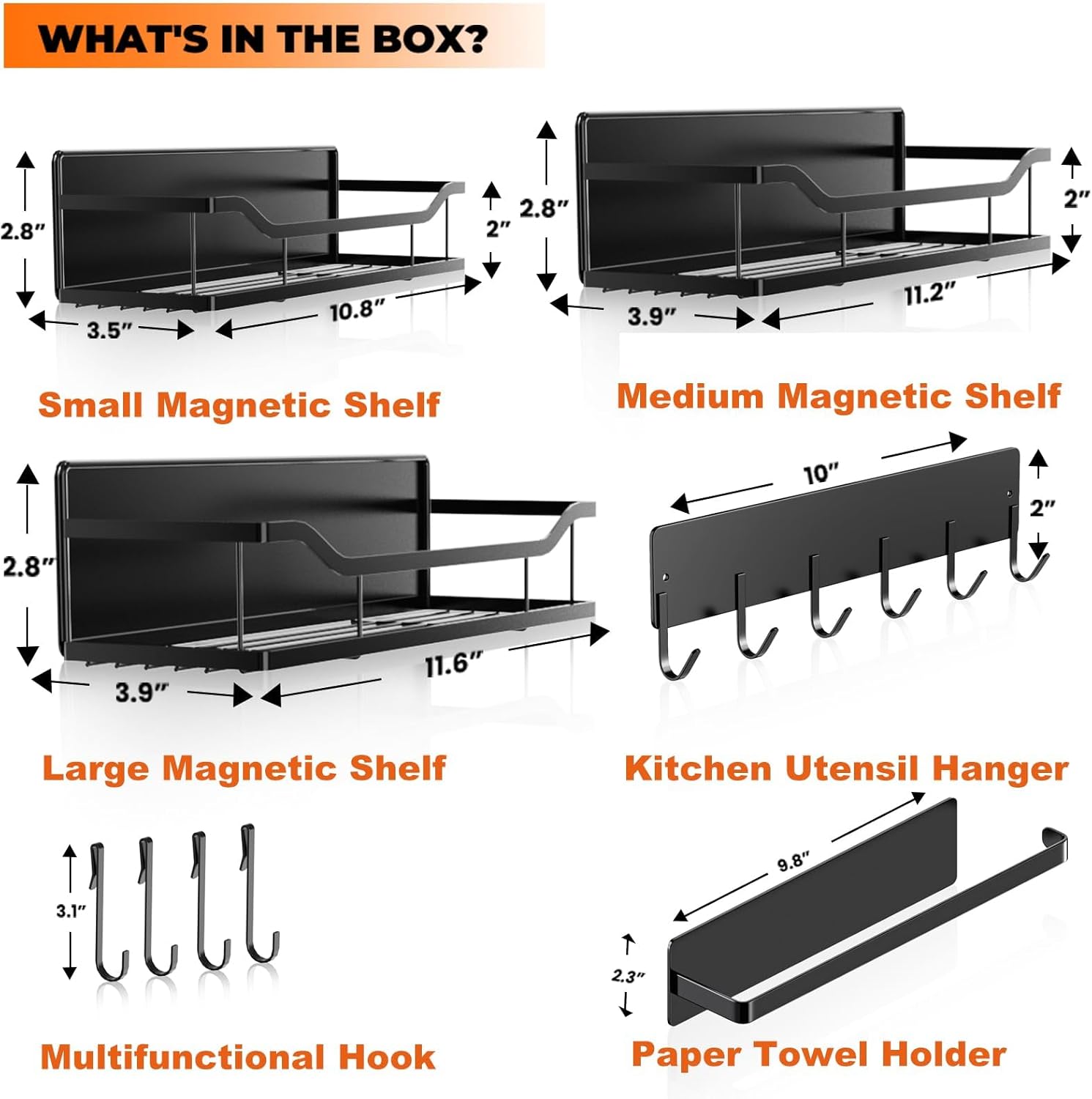 - 5 PACK MAGNETIC RACKS: Include 3 magnetic shelves in different sizes for spices, condiments, bottles,plus 1 magnetic Paper Towel Holder, 1 magnetic Utentils Hanger with 3 hooks for kitchen tools, oven mitts, or towels.