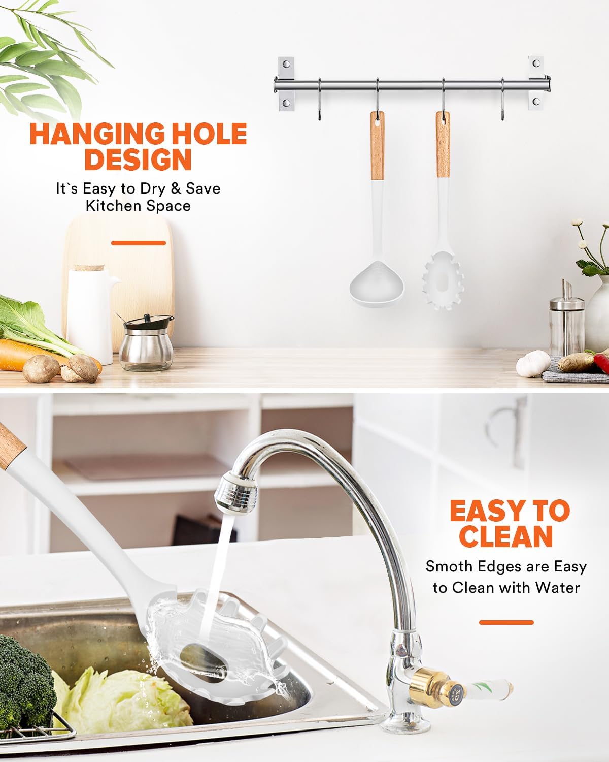 Pasta Fork and Ladle Set, Perfect for Serving Hot Soup, Stirring, and Sauce Pasta, BPA-Free Matte Silicone, Wood Handle Spaghetti Spoon for Nonstick Cooking Surfaces (White)