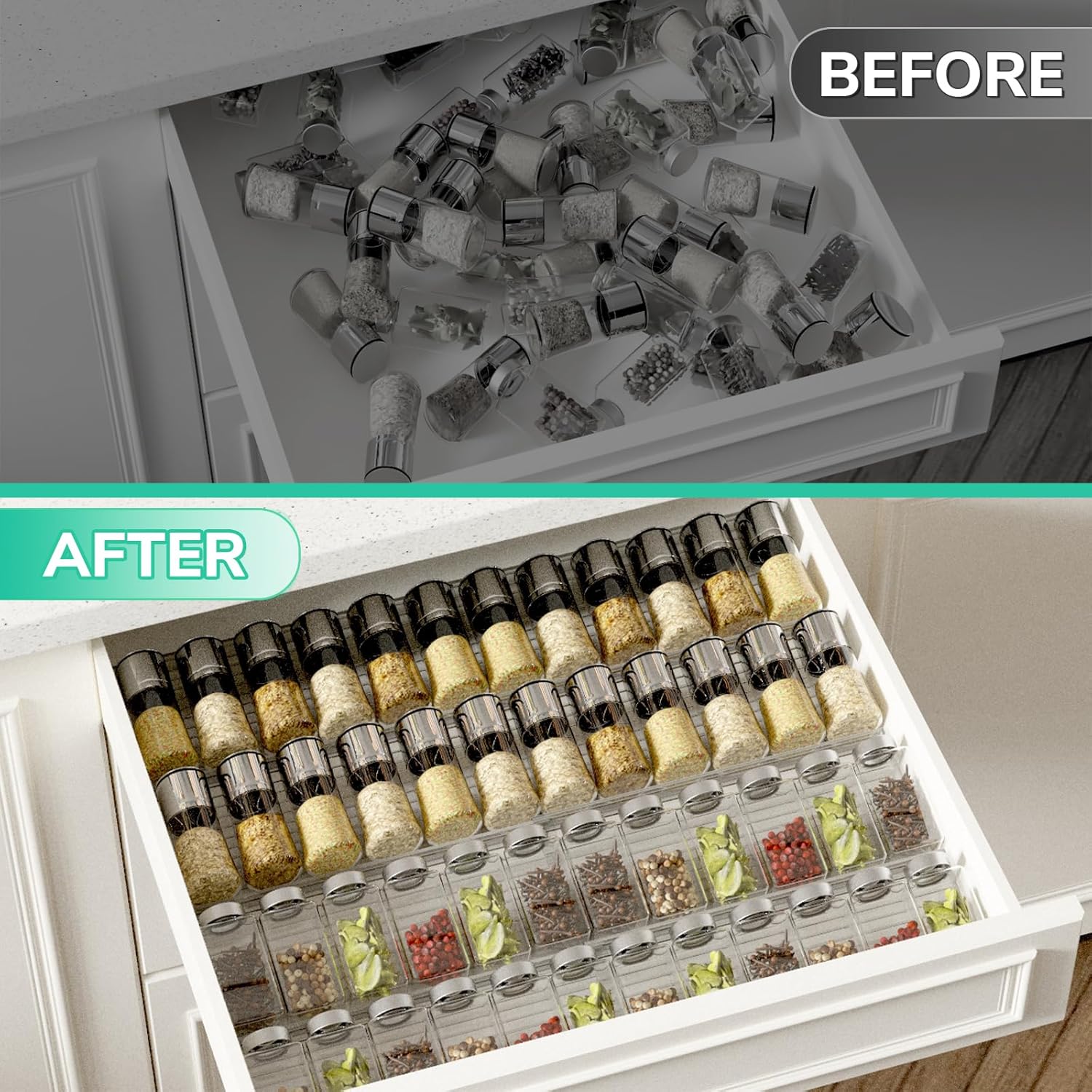 - Space-Saving & Multi-Purpose: Compatible with various drawer, cupboard, and cabinet sizes, this dawer spice rack organizer helps save space and can also be used to organize nail polish, perfumes, lipsticks, and more—perfect for versatile storage.