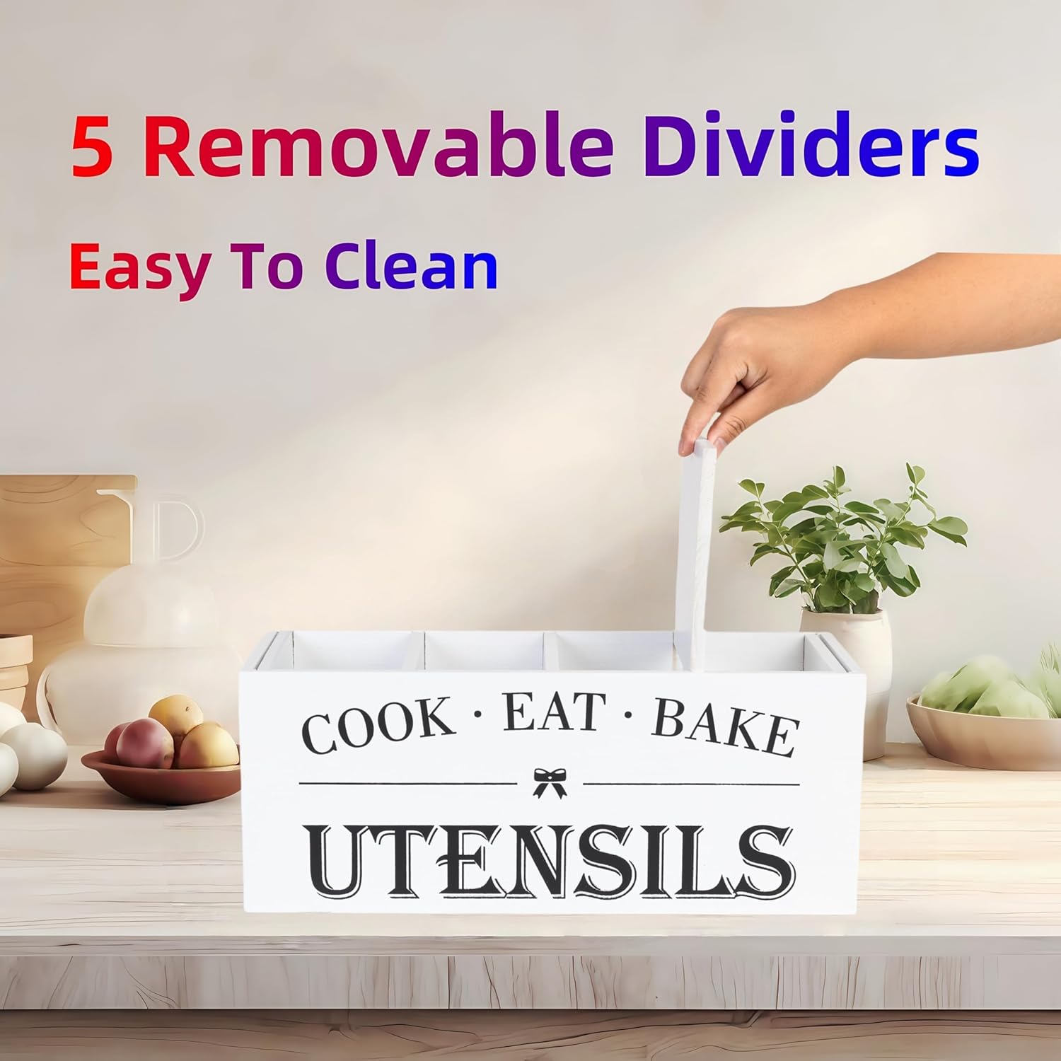 - 4 Detachable Compartments: Our innovative design features four removable compartments, offering unparalleled flexibility and customization. Easily rearrange or remove compartments to suit your needs, whether you're storing longer utensils like rolling pins or smaller items like measuring spoons. This modular system ensures that every item has its designated place, making it simpler to find what you need when you need it.