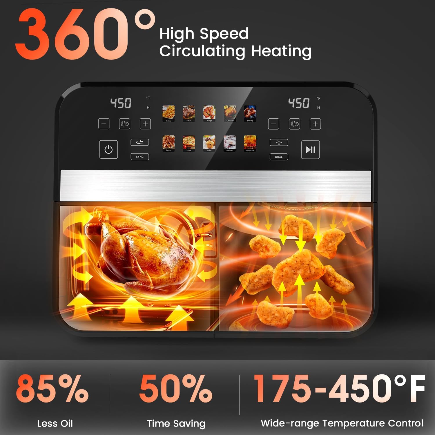 - 【Smart Sync & Dual Cook Technology】Use the SYNC FINISH and DUAL COOK features to match cooking times or set different modes for each basket. Say goodbye to waiting and hello to precision cooking.